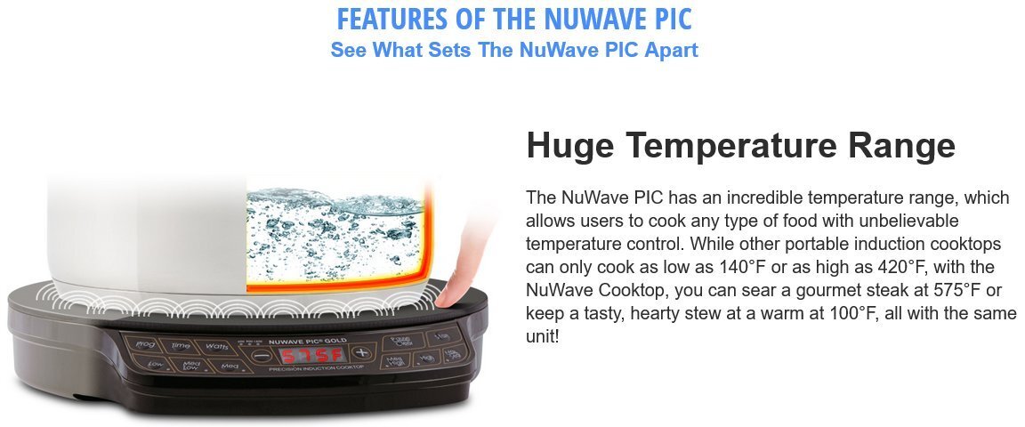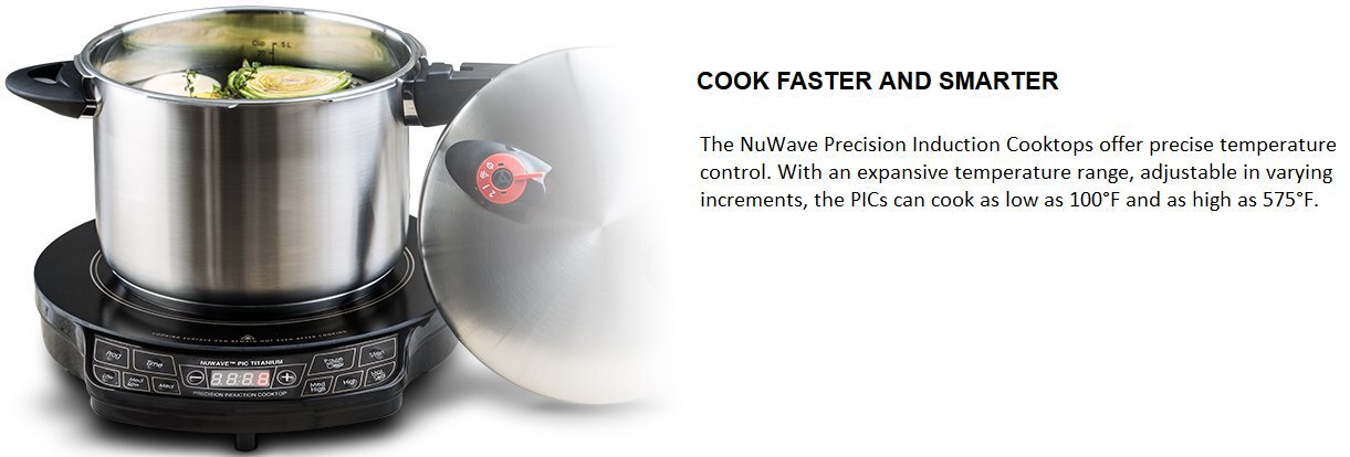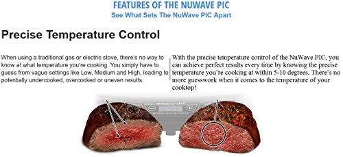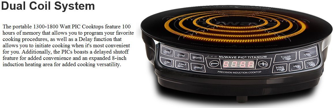 Product description: The NuWave PIC Pro is comprised of a series of magnetic coils. These coils generate magnetic fields that produce a warming reaction in steel and iron based pots and pans. In this way, heat is generated in the cookware and not on the cooktop surface, which is much more energy efficient than traditional gas or electric ranges. Induction cooking is the most eco-friendly way to prepare meals because the method releases no toxins into the environment. Induction cooking emits no flame, so less residual heat is produced in your own kitchen. The cooktop remains cool to the touch where the magnetic surface is not activated.