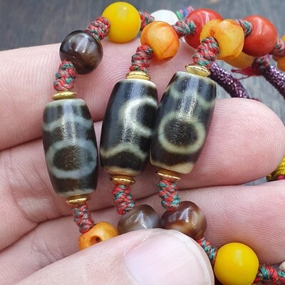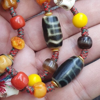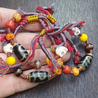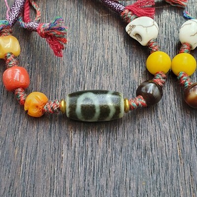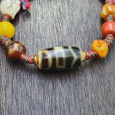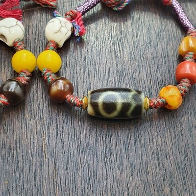 Le bracelet de perles Dzi fait a la main presente un cordon multicolore et des perles spirituelles, originaires du Tibet. Fabrique avec de l'agate comme materiau principal, ce bracelet original vintage reflete une histoire riche et une signification culturelle. Fabrique avec soin et attention aux details, ce bracelet est une piece unique et belle qui incarne l'artisanat tibetain traditionnel.