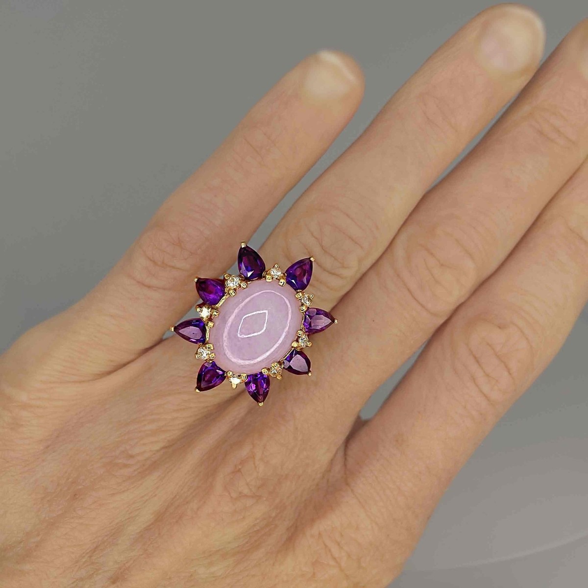 The untreated nature of the large lavender jade cabochon makes this ring a really wonderful ring to pass down in the family for generations to come!
