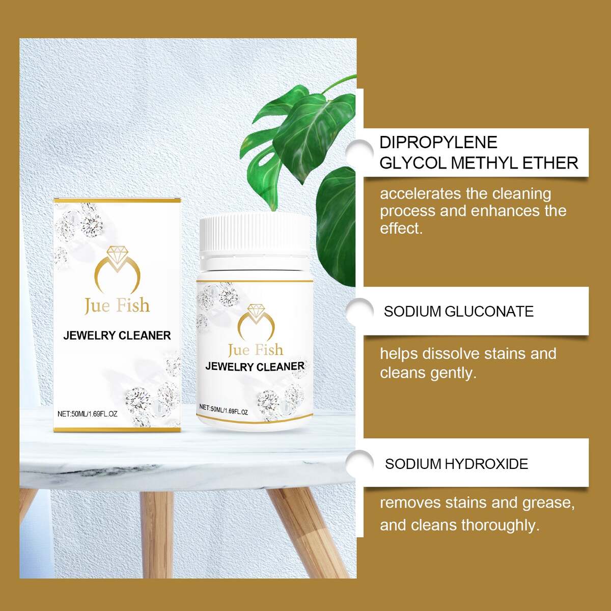 Our jewelry cleaner contains sodium gluconate and sodium hydroxide. It can make your jewelry, accessories and trinkets sparkle, and its use is simple: put the jewelry in a container. Pour in just enough cleaner to cover the whole piece. After 15 to 30 seconds, remove the jewelry and gently dry it with a towel to restore gloss. And can effectively decontamination, restore luster.