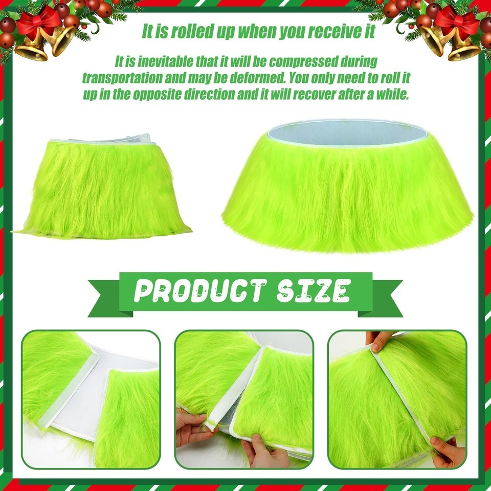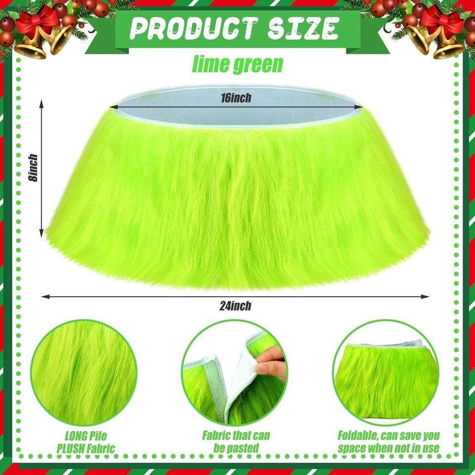 Features: Our Christmas tree collar is equipped with rustic look that blends with the farmhouse decor style. This significant piece transports you to a serene countryside holiday, creating a warm and inviting Christmas atmosphere. The idea of a Christmas tree skirt gets a significant upgrade with our Christmas tree collar. This striking piece hides the trunk of the Christmas tree, offering a modern twist to the traditional Christmas tree skirt. It's an innovative solution that teams functionality with festive cheer, making your Christmas tree the centerpiece of holiday decorations. Specifications: Material: quality longhair material Color: lime green Size: top diameter 16 inches/ 40.64 cm, bottom diameter 24 inches/ 60.96 cm, height 8 inches/ 20.32 cm Package includes: 1 x Christmas tree collar Notes: Manual measurement, please allow slight errors on size. The color may exist a slight difference due to different screen displays.