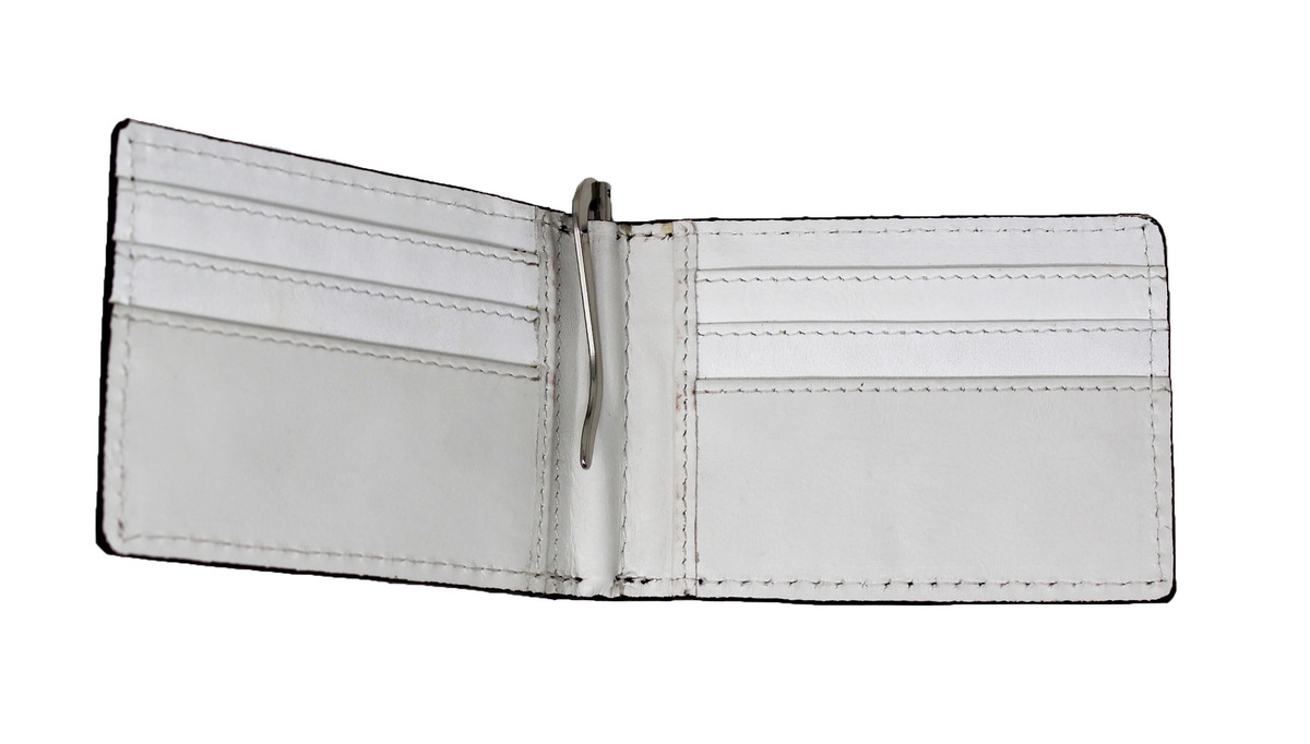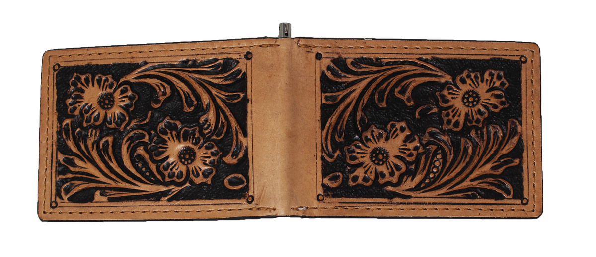 Challenger men's western minimalist money clip wallet hand-made from supple genuine full-grain leather. Wallet comes accented with a hand-tooled antique floral design. Wallet measures 4" L x 3" H, and features six credit card slots.