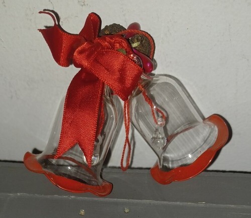 2 Bell Cluster Clear Glass Christmas ornament Red Rim Pine cones 3"