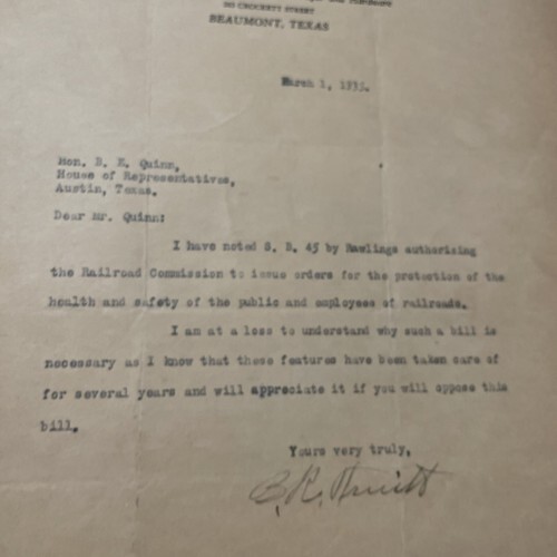 Letter is to B. E. Quinn who was the state representative from the Beaumont area