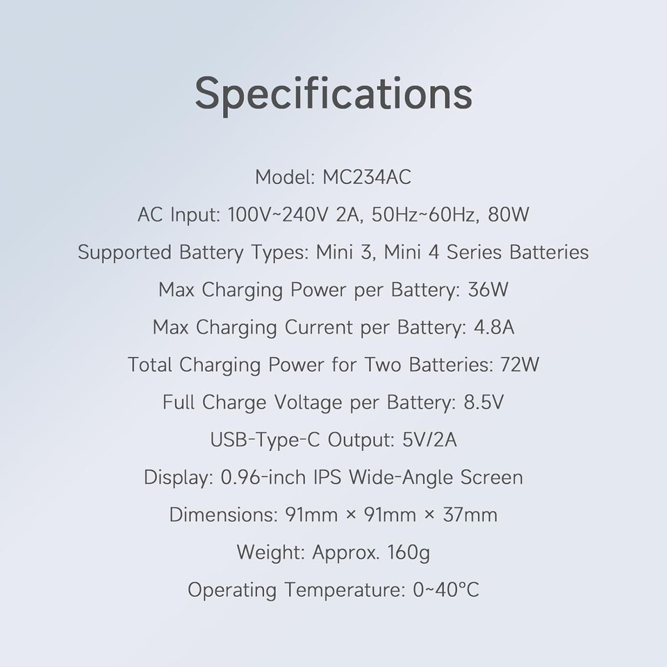 Compact Portable Design Measuring 91mm x 91mm x 37mm and weighing only about 160g, the MC234AC is small in size and light in weight. Easy to carry for outdoor drone operations. A must - have accessory for DJI Mini series drone enthusiasts to keep power always on standby.