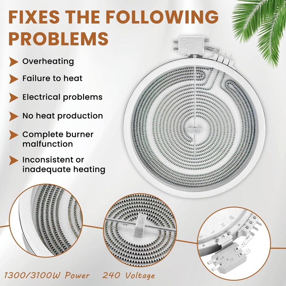 ?????????? ??? ????????3100/1300W, 240V. The WB30T10133 radiant surface heating element is constructed from a new composite metal material, offering high-temperature resistance, rapid heating, and uniform heat distribution. It delivers long-term stable performance, surpassing OEM quality. The WB30T10133 heating element provides dual heating zones for consistent, even cooking performance, suitable for most 9-inch stove heating elements