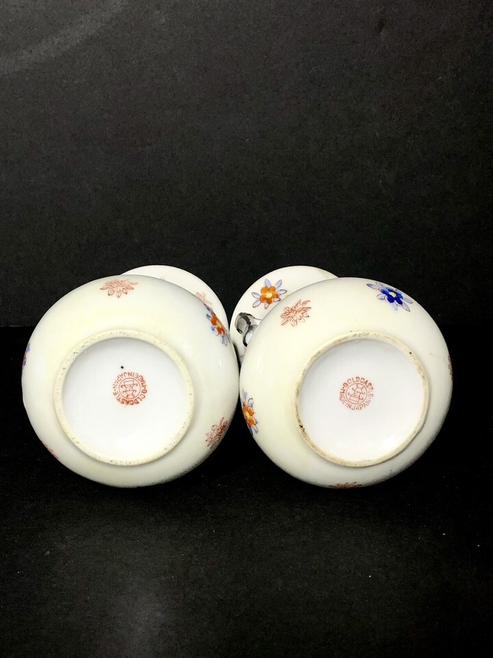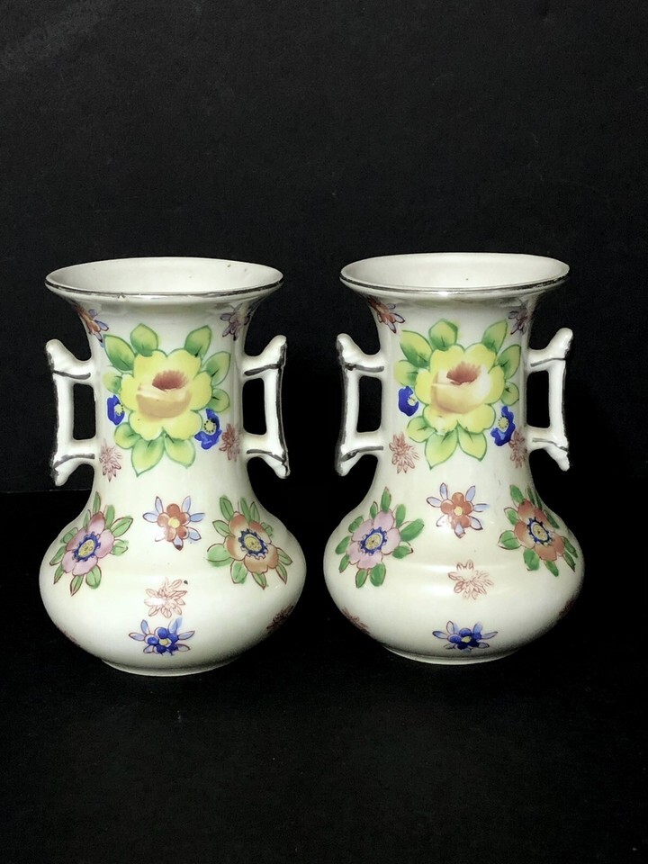 This is a set of two vintage Gold castle vases from Japan. Each vase features a floral design with a silver rim, double handles, and measures 5 inches in height. The vases are multi-colored and showcase a Victorian style. These items are original vintage pieces.