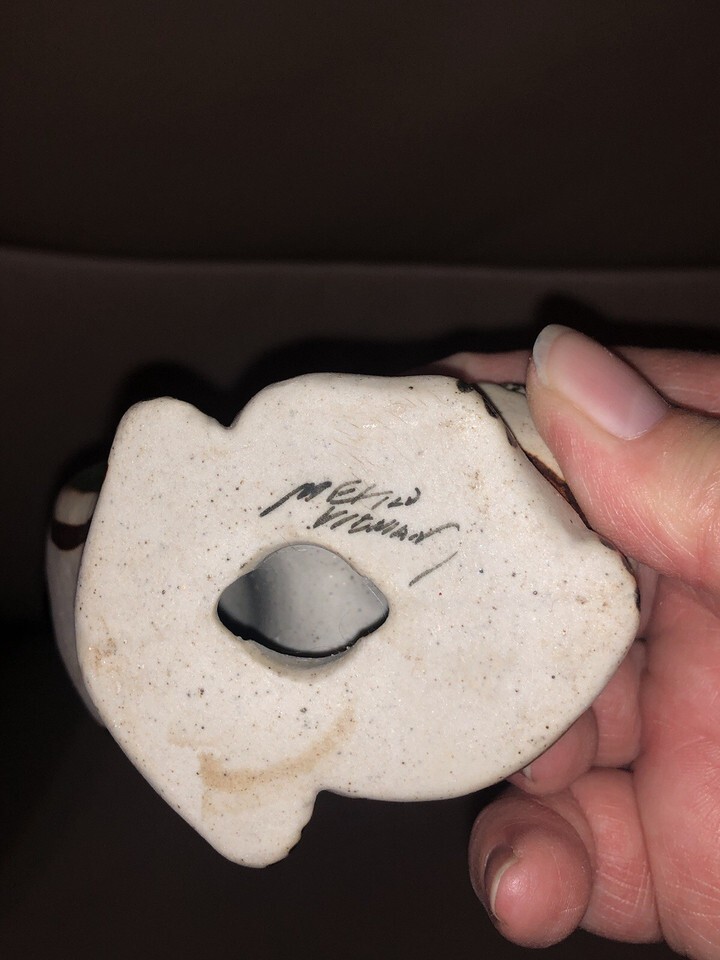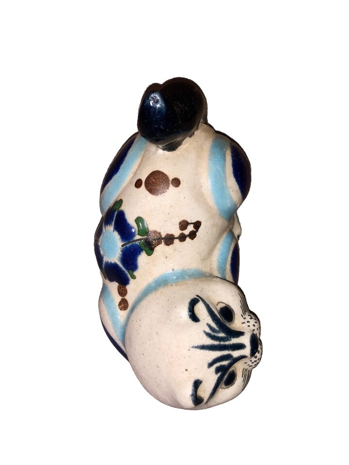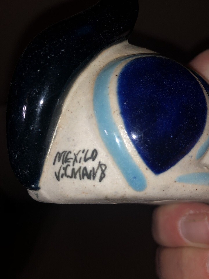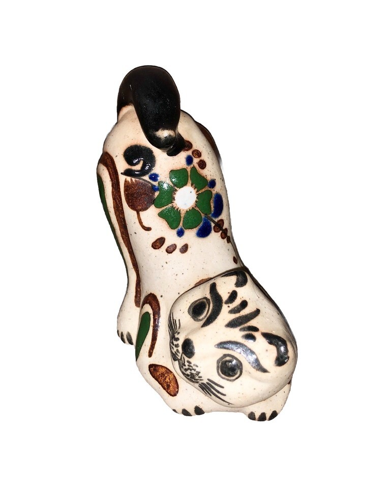 This vintage Mexican Tonala Folk Art Pottery Cat Figurine set of 2 is a charming addition to any collection. Handmade and hand painted in Mexico, these cat figurines feature traditional Mexican design and are signed by the artist, Vicman. The rich colors and intricate details of these pieces showcase the unique culture and craftsmanship of Mexican artisans. Perfect for cat lovers or collectors of Latin American art, these figurines are a beautiful representation of Mexican Folk Art.