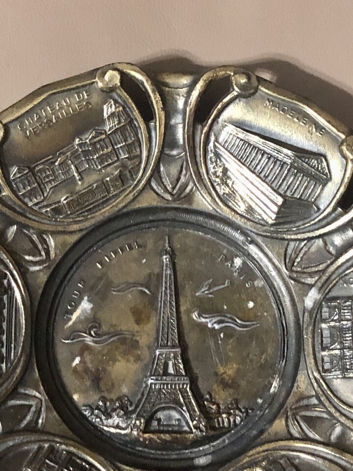 This Vintage Heavy Metal maybe pewter SOUVENIR de PARIS Ashtray Trinket Dish is a unique and stylish piece that pays homage to the iconic Eiffel Tower and other famous sites. Made in France, this 6.5" trinket dish or ashtray is a collectible item perfect for those who appreciate vintage memorabilia. The metallic finish adds a touch of edgy sophistication, making it a standout piece for any home decor or travel collection. Ideal for storing small trinkets or as a functional ashtray, this souvenir from Paris is a must-have for any heavy metal enthusiast or Francophile collector.