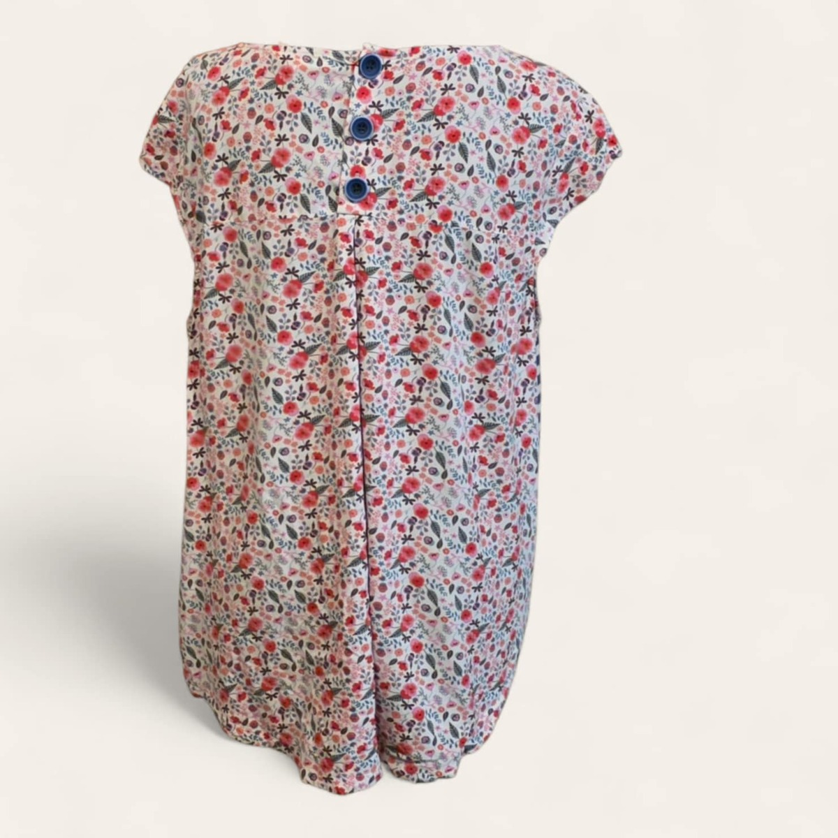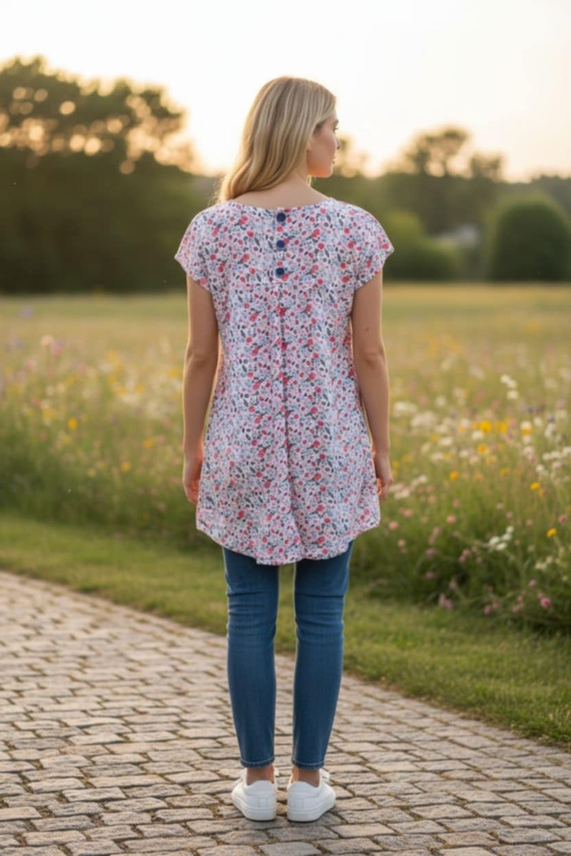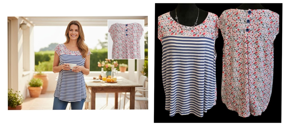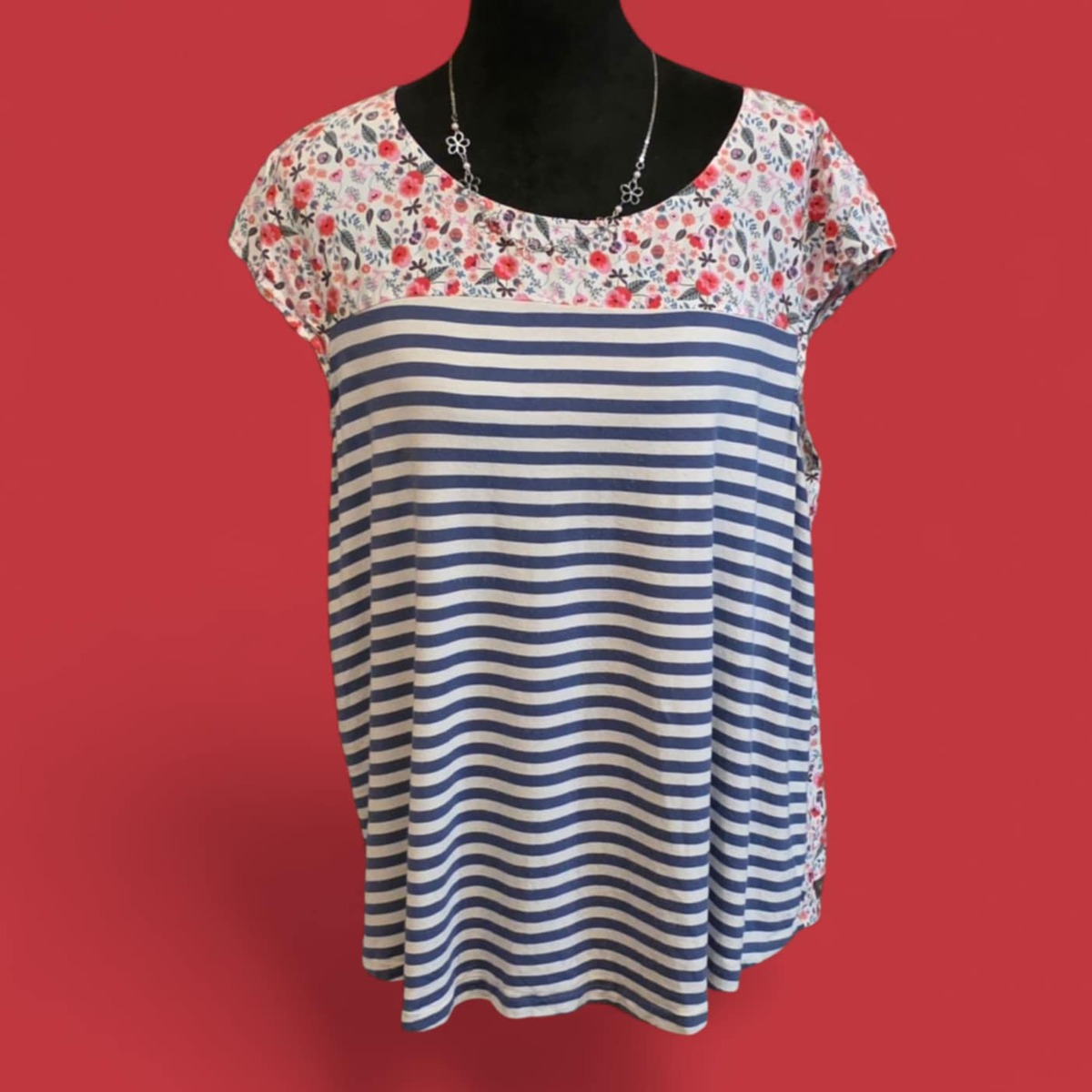 This is the Matilda Jane State Lines Floral Print Blouse Top. It features a blue and white striped pattern on the front, with a floral print on the top yoke and the back of the shirt. The top is made of 100% rayon and has buttons down the back. The blouse is described as having a high-low hem and a flattering fit