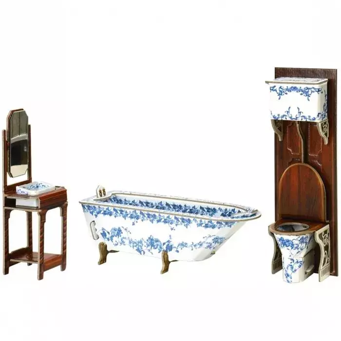This detailed 3D cardboard model kit allows you to assemble a complete miniature bathroom set for your dollhouse. The kit includes a clawfoot bathtub, sink with mirror, and toilet — all printed with elegant blue porcelain-style patterns.