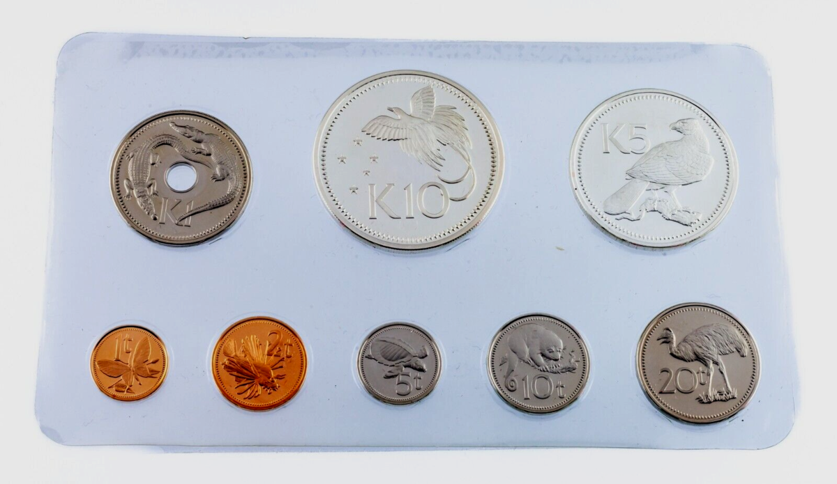 Incluye 8 monedas: 10 Kina, 5 Kina, Kina, 20 Toea, 10 Toea, 5 Toea, 2 Toea, Toea
