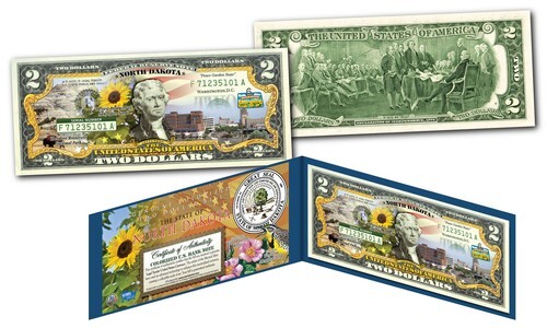 Celebrate America with the popularity of the statehood series with these colorized $2 bills. Each bill features the state's name, bird, flower, nickname, emblem, year of admission, and State Quarter graphic. The State Quarter featured on the bill is an actual watermark security feature?the first of its kind! Americans from all over the country are rushing to obtain the new ?Statehood? Genuine Two Dollar bills, while they last. The coveted U.S. Government $2 bill is rarely seen in circulation and only banks and currency dealers may obtain special uncirculated bills directly from the Federal Reserve Bank. Now for the first time ever these enhanced uncirculated full color two dollar bills are available exclusively from this limited time offer. Two dollar bills are among the most beautiful of all U.S. circulating currency and now the rarely circulated $2 bill is even rarer with exclusive overlay of our beautiful States. Each Bill comes with a full-Color Certificate of Authenticity handsomely displayed in a Special Gold Foil Museum-Quality Folio. Don?t Miss Your Chance to Order?.Very Limited Quantity Available!