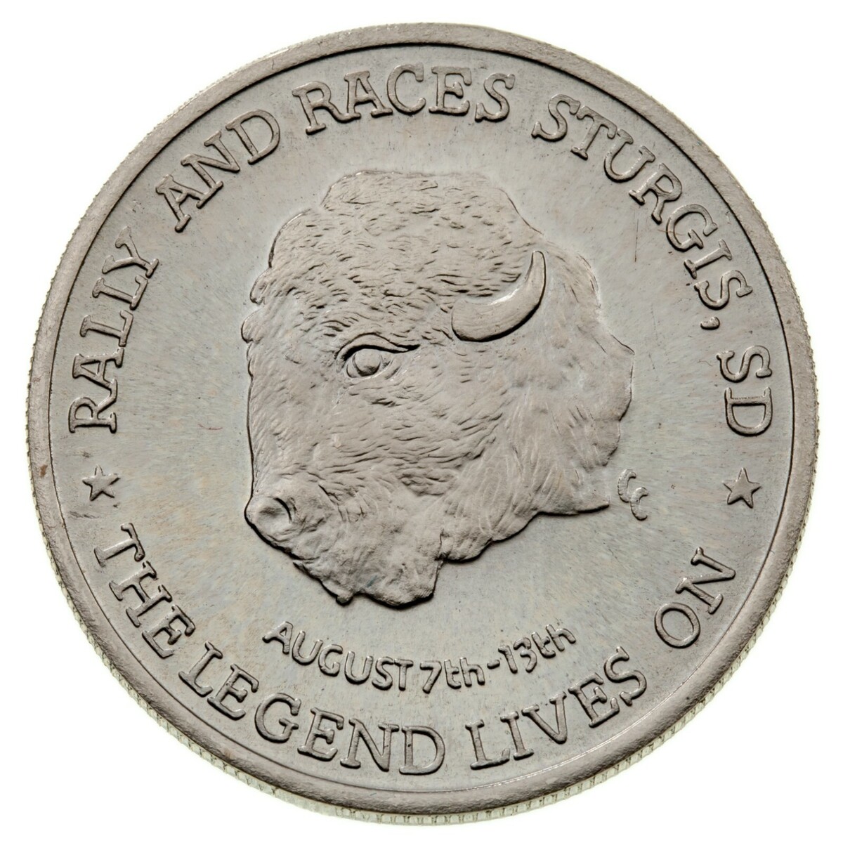 Anverso: Cabeza de bisonte mirando hacia la izquierda "RALLY AND RACES STURGIS, SD" LA LEYENDA SIGUE VIVA"