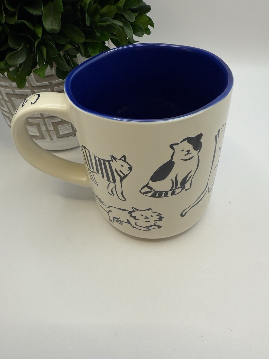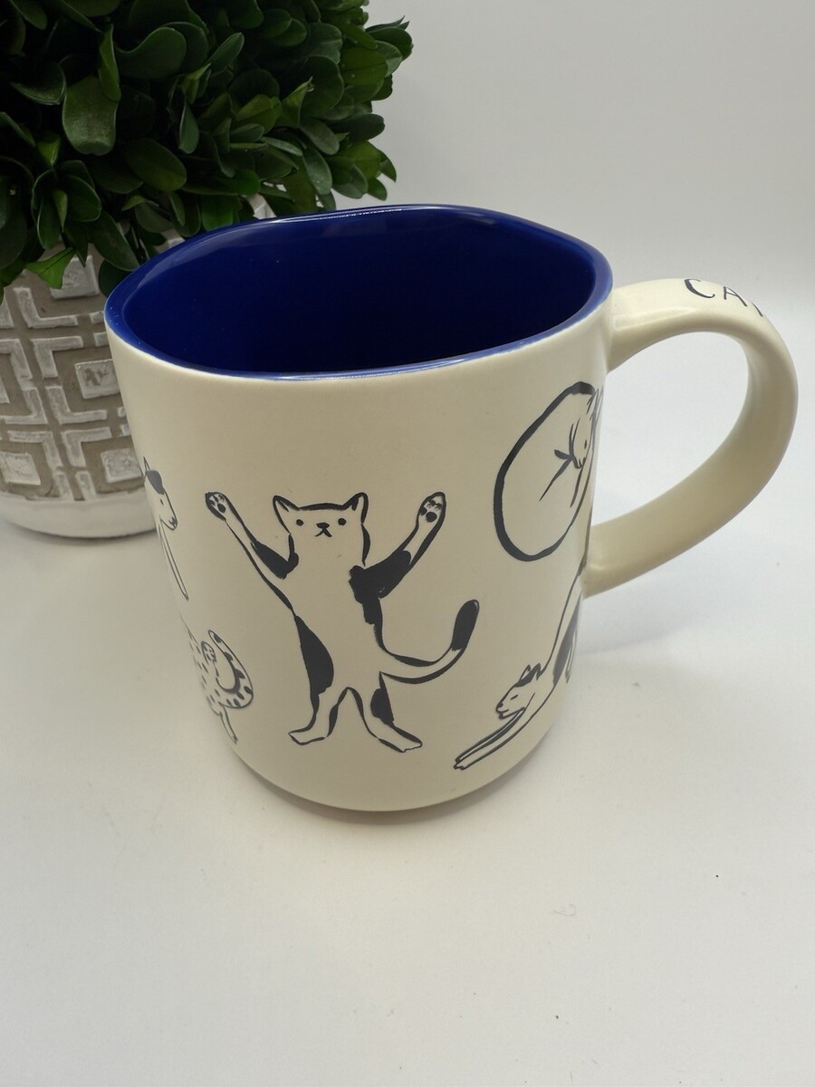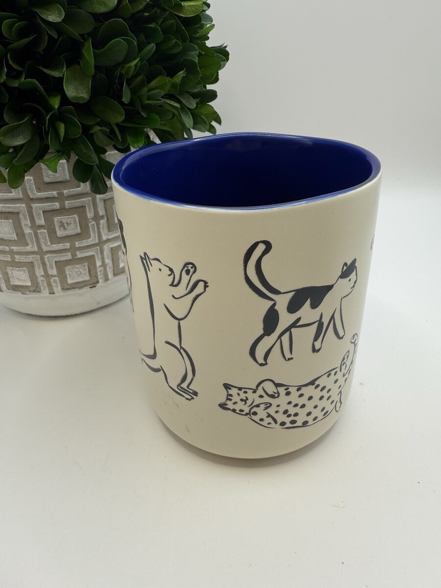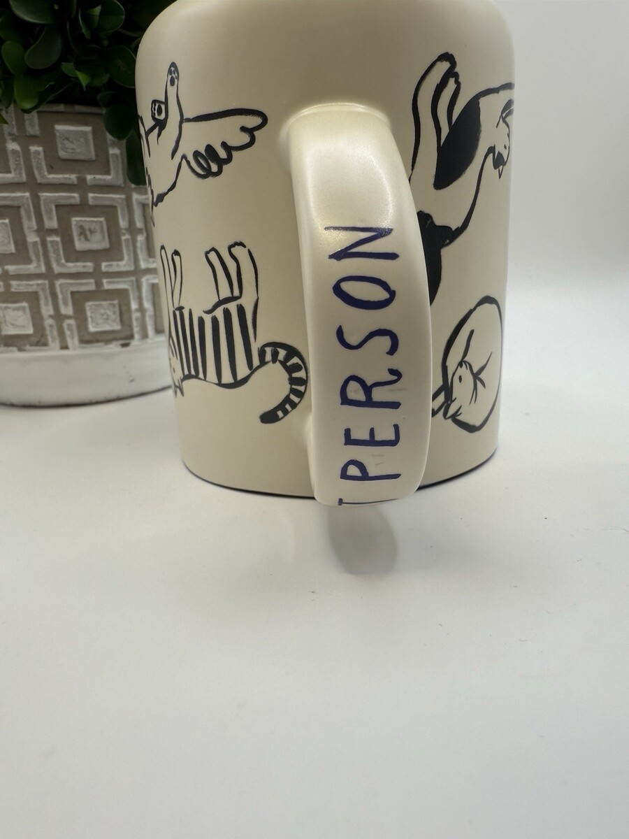 Charming Opalhouse ?Cat Person? stoneware mug from Target, featuring playful black-line cat illustrations on a cream background and a deep blue interior. Handle reads CAT PERSON.