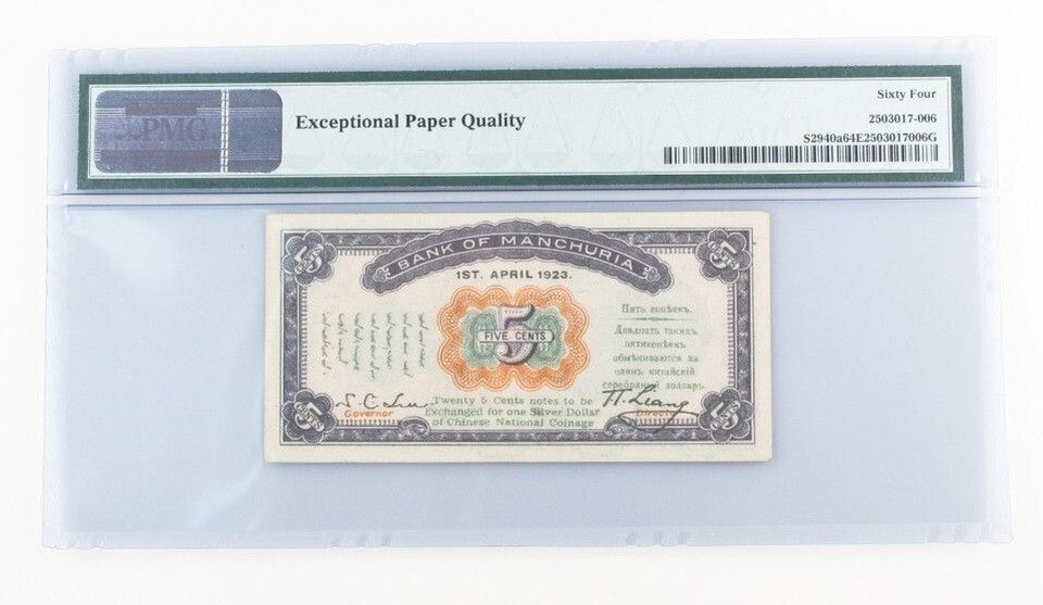 Sealed in a PMG holder with the label "China, Bank of Manchuria // Pick# S2940a S/M#T214-150a 1923 5 Cents // S/N 1072794 - Harbin"