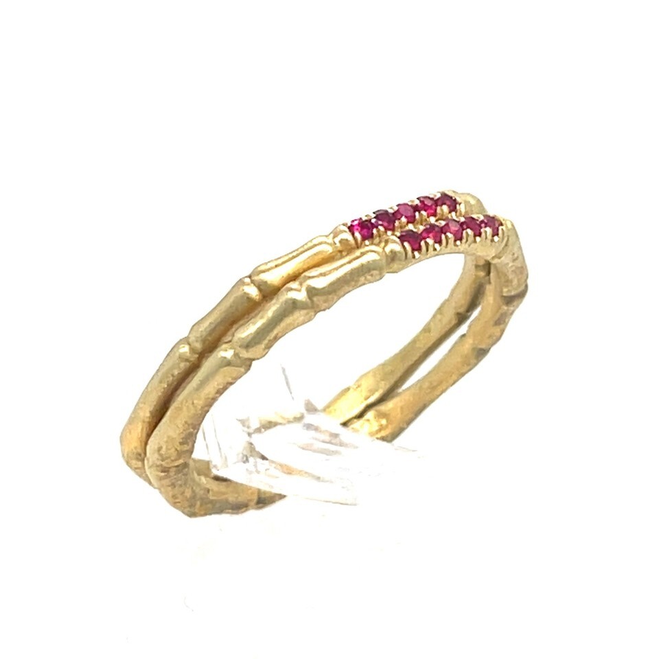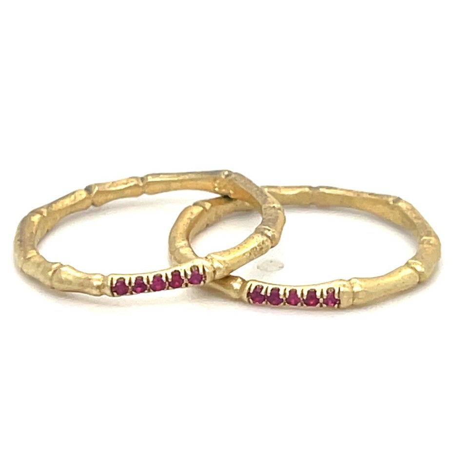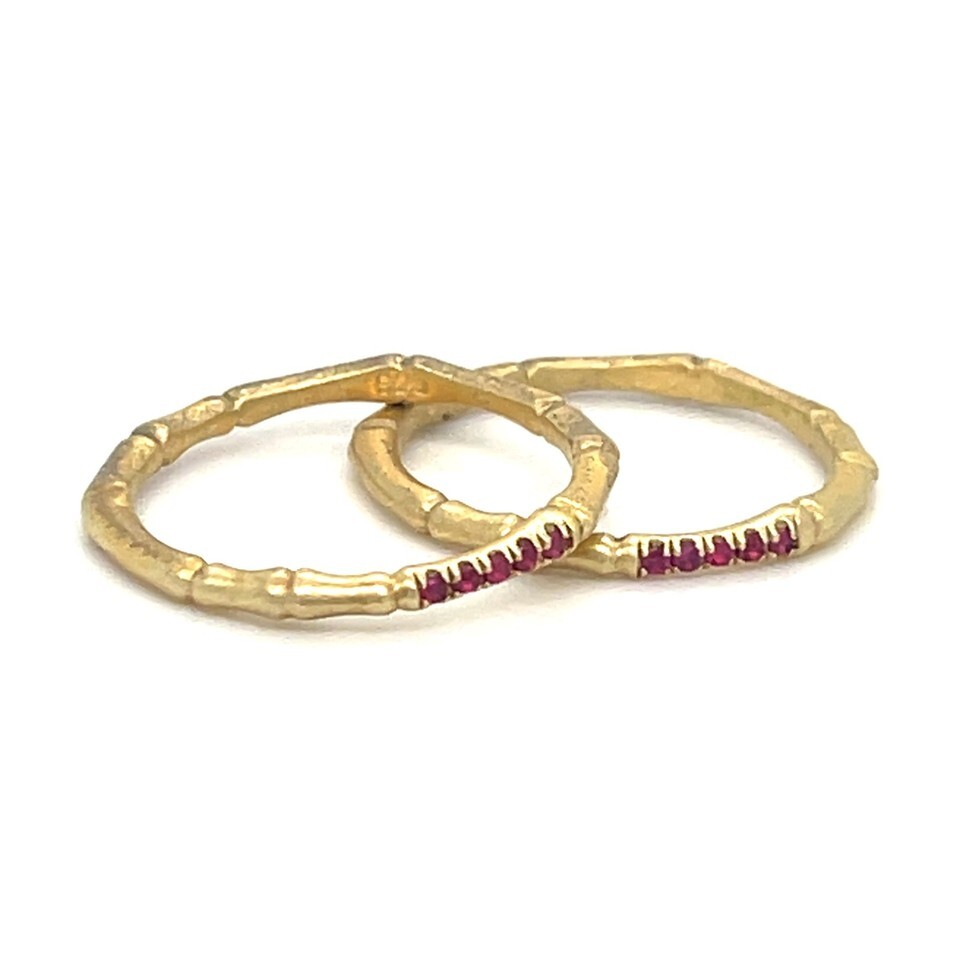 Sterling Silver 18k Yellow Vermeil Bamboo 2mm Ring w/ 0.05 TCW Red Spinel Accents Sz 5.75