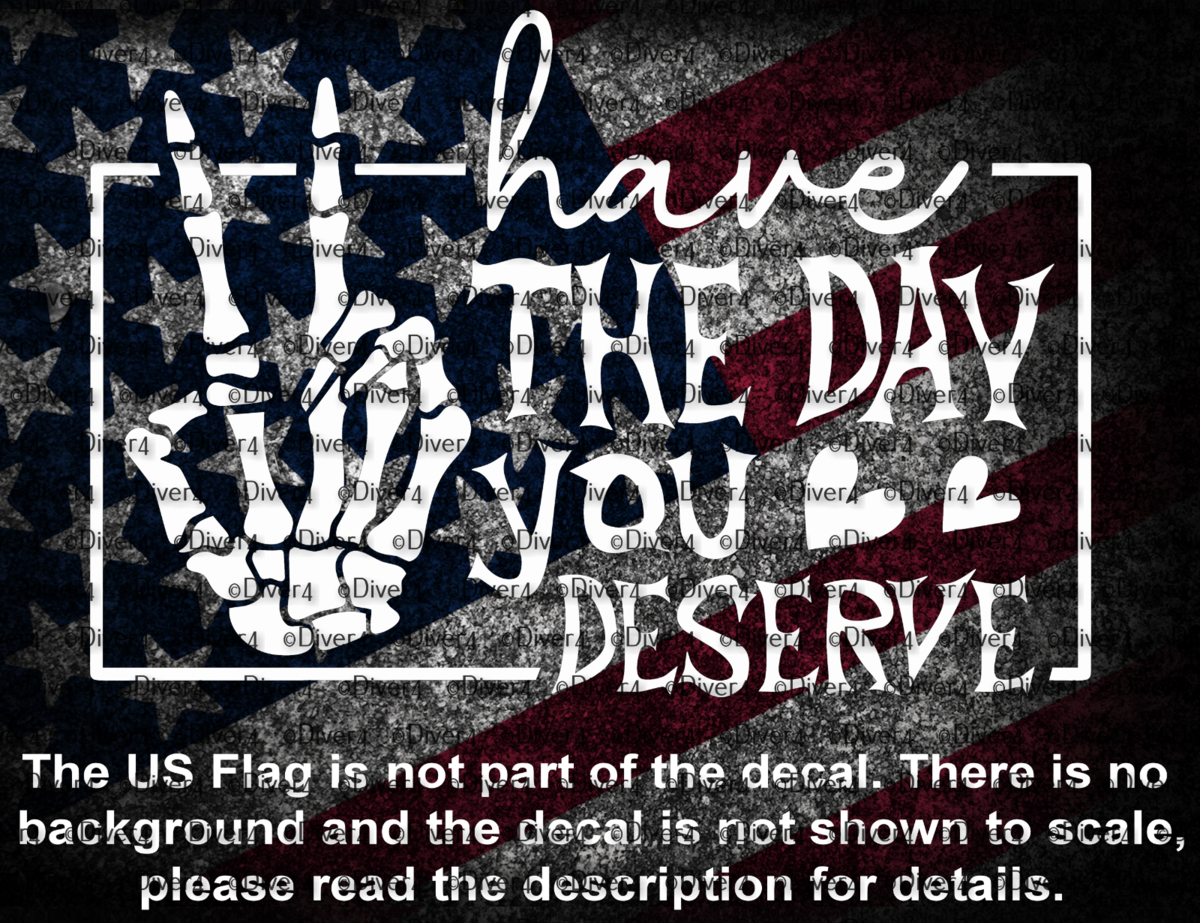 This is a custom Have The Day You Deserve Skeleton Hand Peace Sign vinyl car/truck window decal sticker.