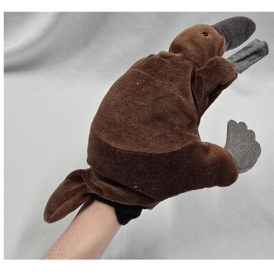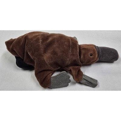 Keywords: platypus, plush, hand puppet, stuffed animal, toy, collectible, wildlife, animal, brown, gray, childrens toy, educational toy, cute