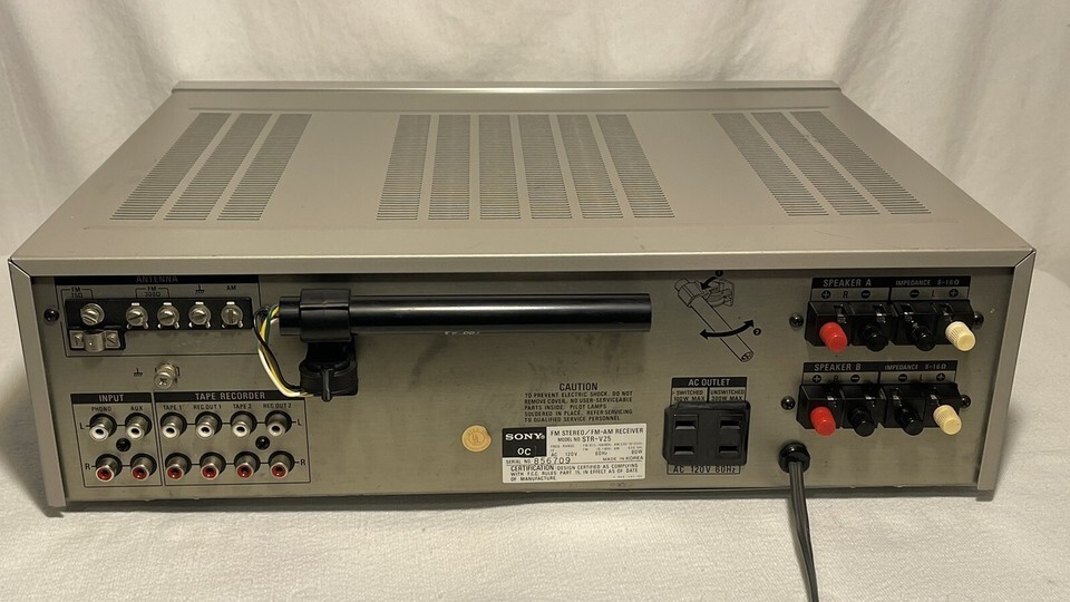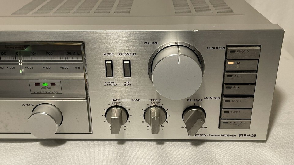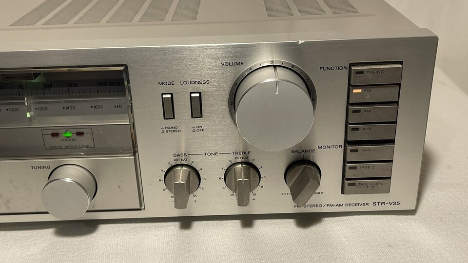 The receiver amplifier is a model STR-V25 and has not been modified in any way. It is compatible with a variety of audio equipment and is sure to provide an excellent listening experience. Don't miss out on the chance to own this vintage gem.