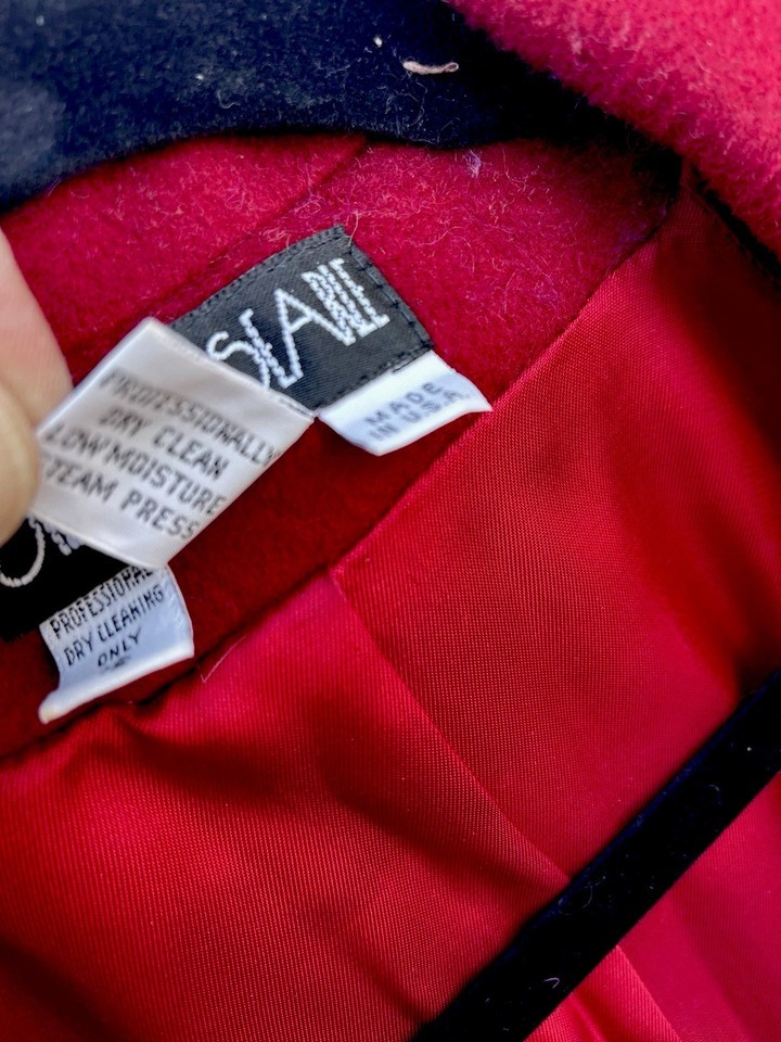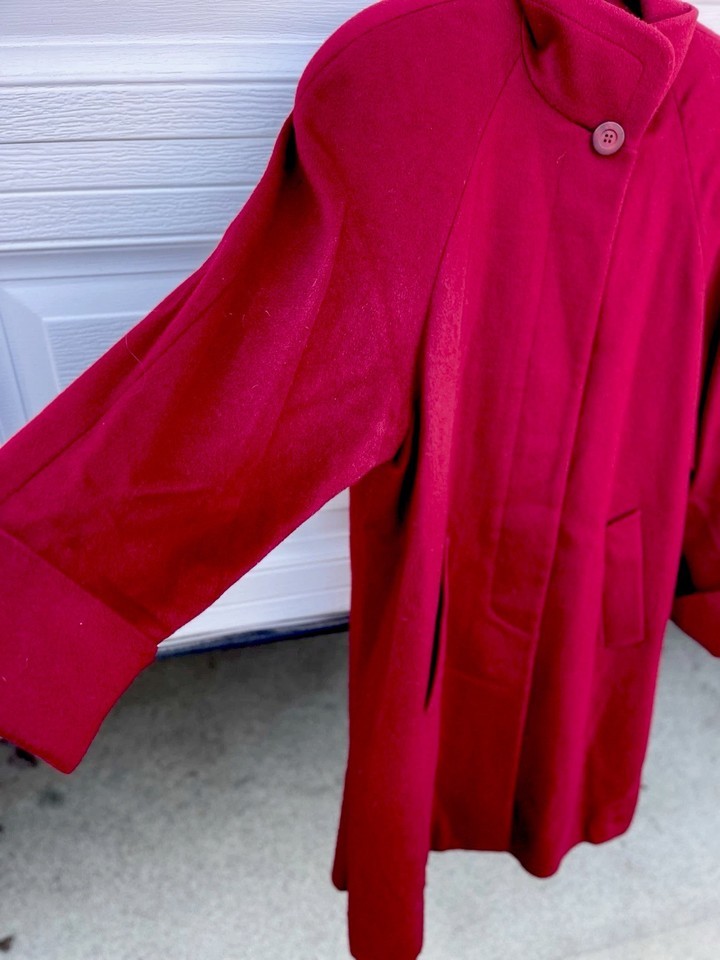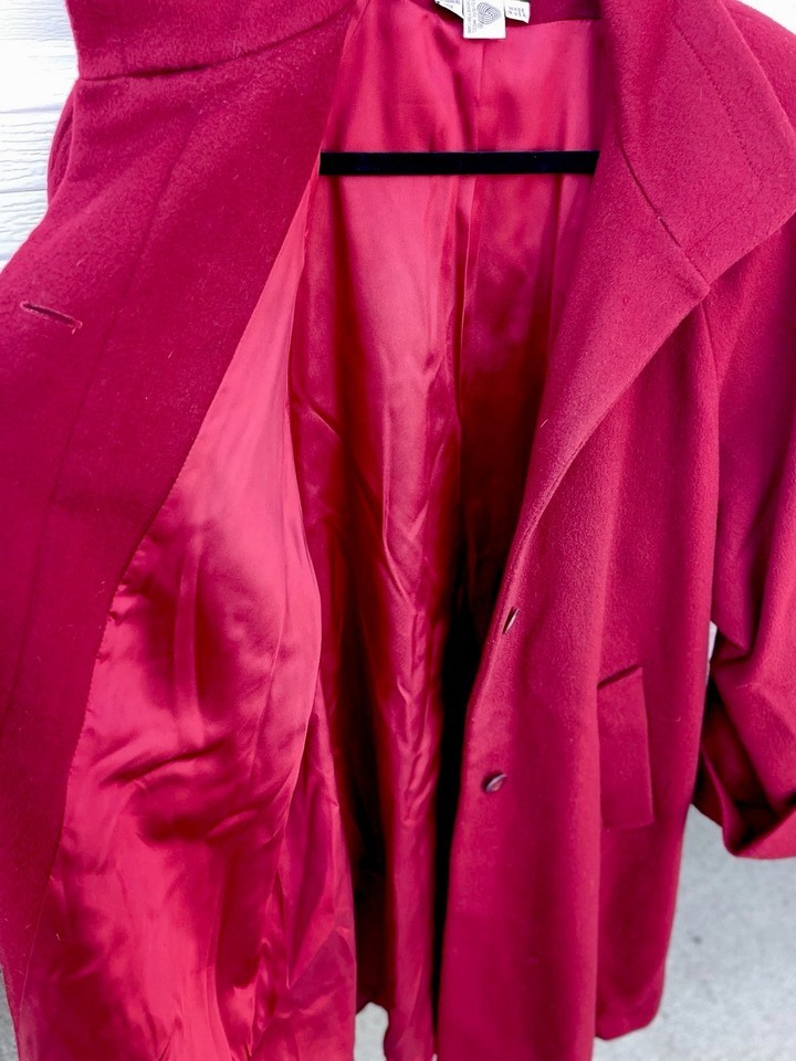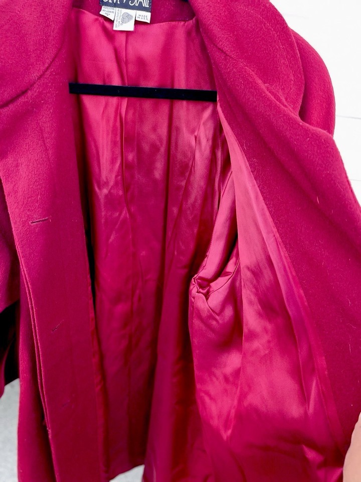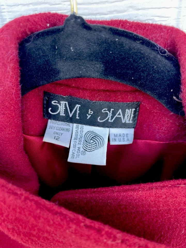 This is a vintage women's trench coat made in the USA by Steve By Searle. It is crafted from 100% wool in a ruby red color, size 12. The coat features a satin lining, reflecting a classic trench coat style with a touch of elegance. It is designed for regular fit and embodies a USA theme.