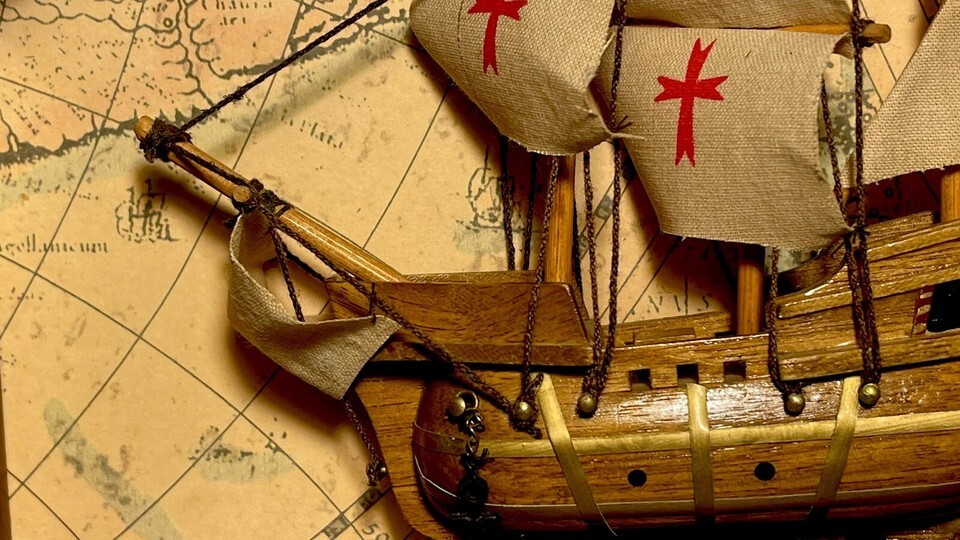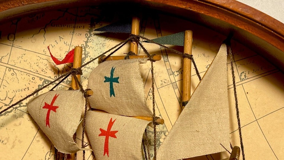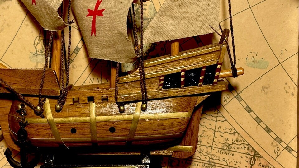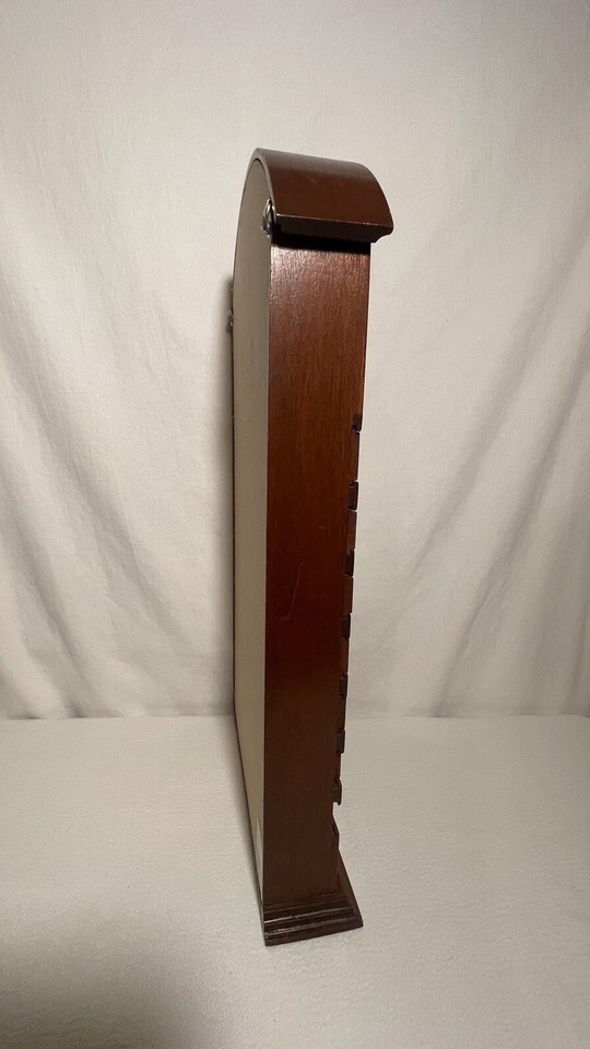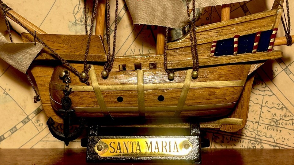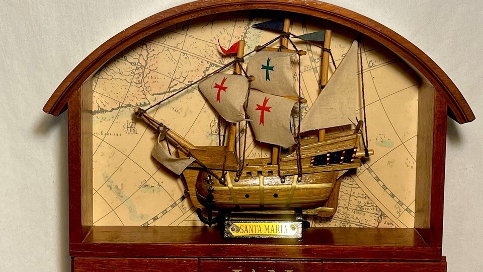 This beautiful vintage wood perpetual calendar is a charming addition to any home or office. Featuring a beautiful Santa Maria model ship, this wall hanging is not only functional but also decorative. The calendar is made from high-quality wood and is in excellent shape, ready to be displayed.