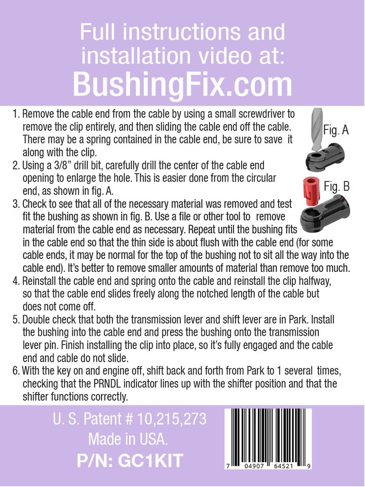 This GC1KIT11? (US Patent # 10,215,273 US Patent # 10,619,723) allows you to quickly and easily repair your automatic transmission shift cable by repairing the cable end that attaches to the transmission shift lever. This particular cable style does not have a bushing but rather plastic prongs that break over time. Our patented replacement sleeve comes complete with replacement prongs and ensures a quality repair with ease. A professional can perform this repair in under 5 minutes, average time for a non-professional is less than 15 minutes. This kit is made from a material that was designed to outlast the factory cable end. BushingFix GC1KIT?- Transmission Shift Cable Bushing Repair Kit ?; (US Patent # 10,215,273 and US Patent # 10,619,723); fitment and catalogue Copyrighted (TX-8-931-983)