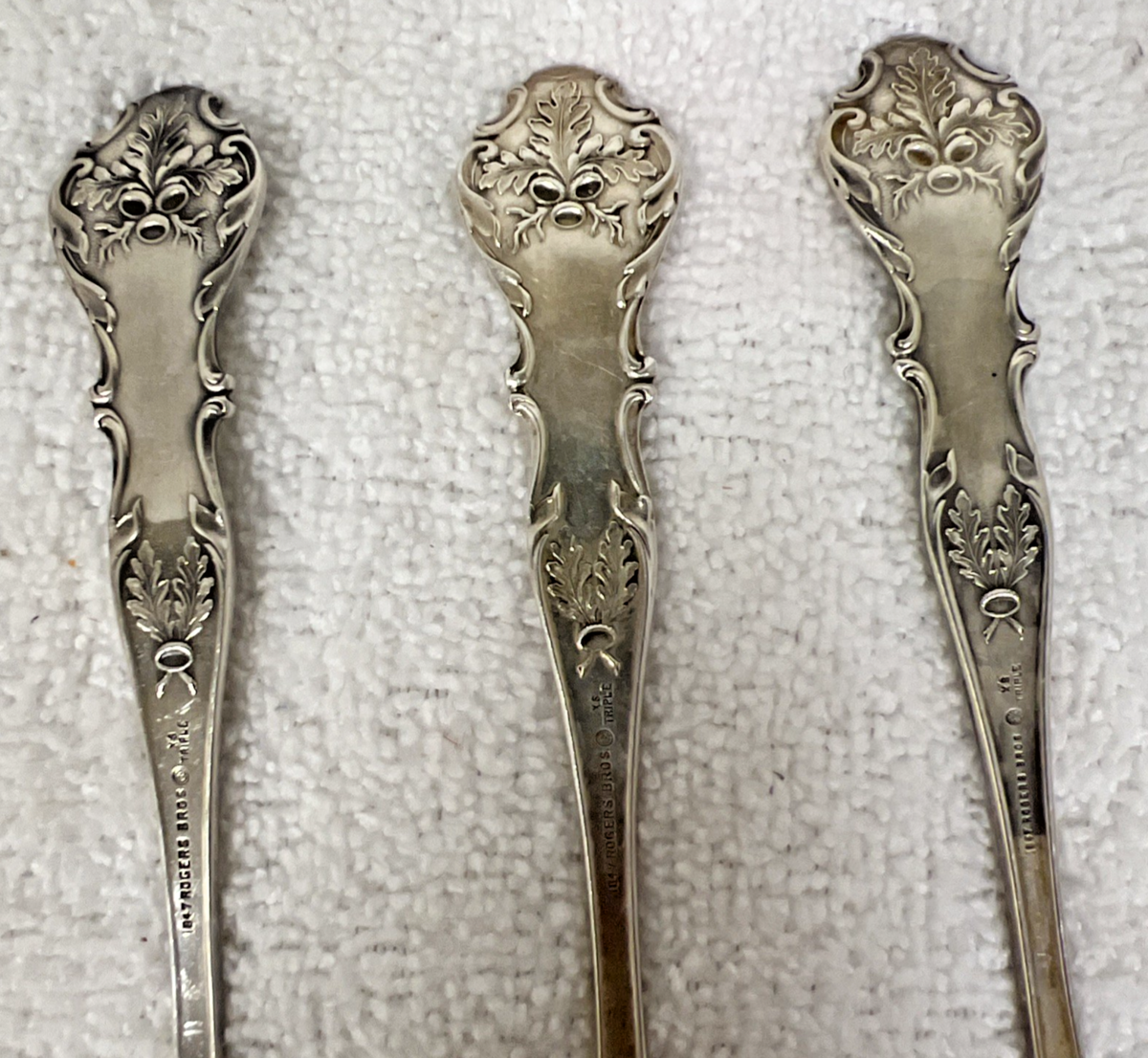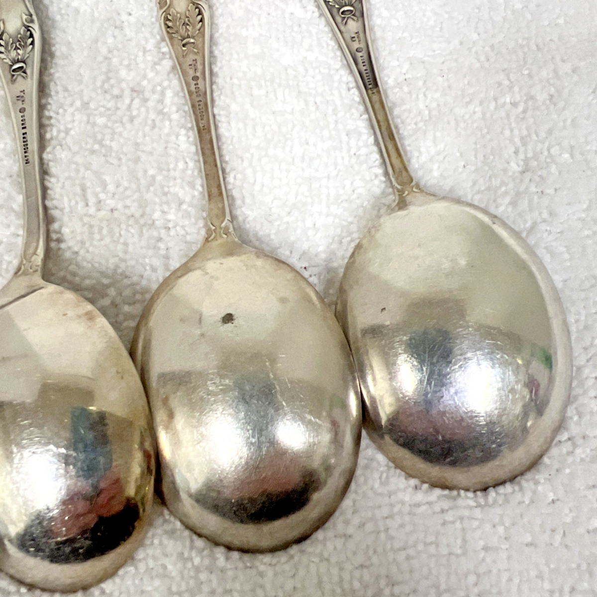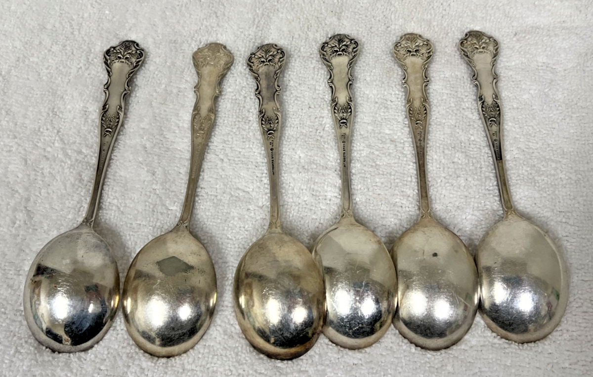 International Silver Charter Oak Silverplate 6 PC Round Bowl Soup Spoon Gumbo 7" 1 is over polished and has a small patch on the back of missing /worn off plate the other 5 are good but could use polish