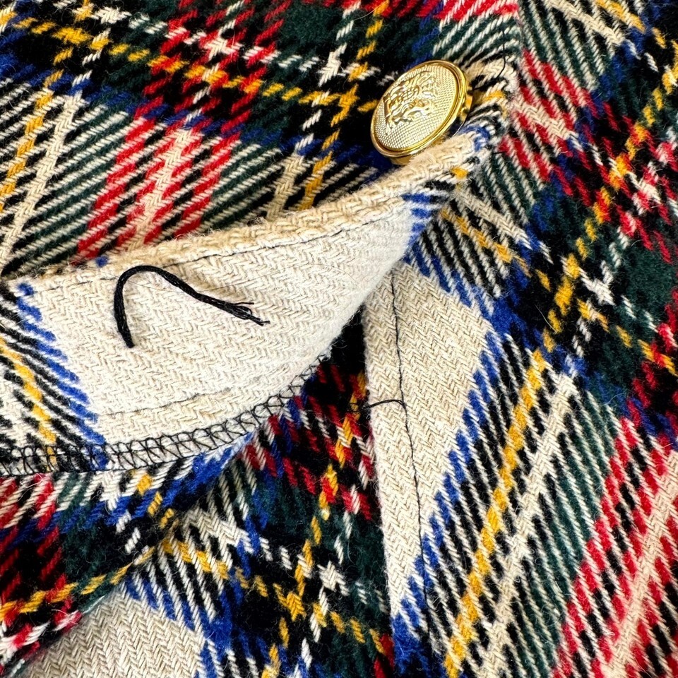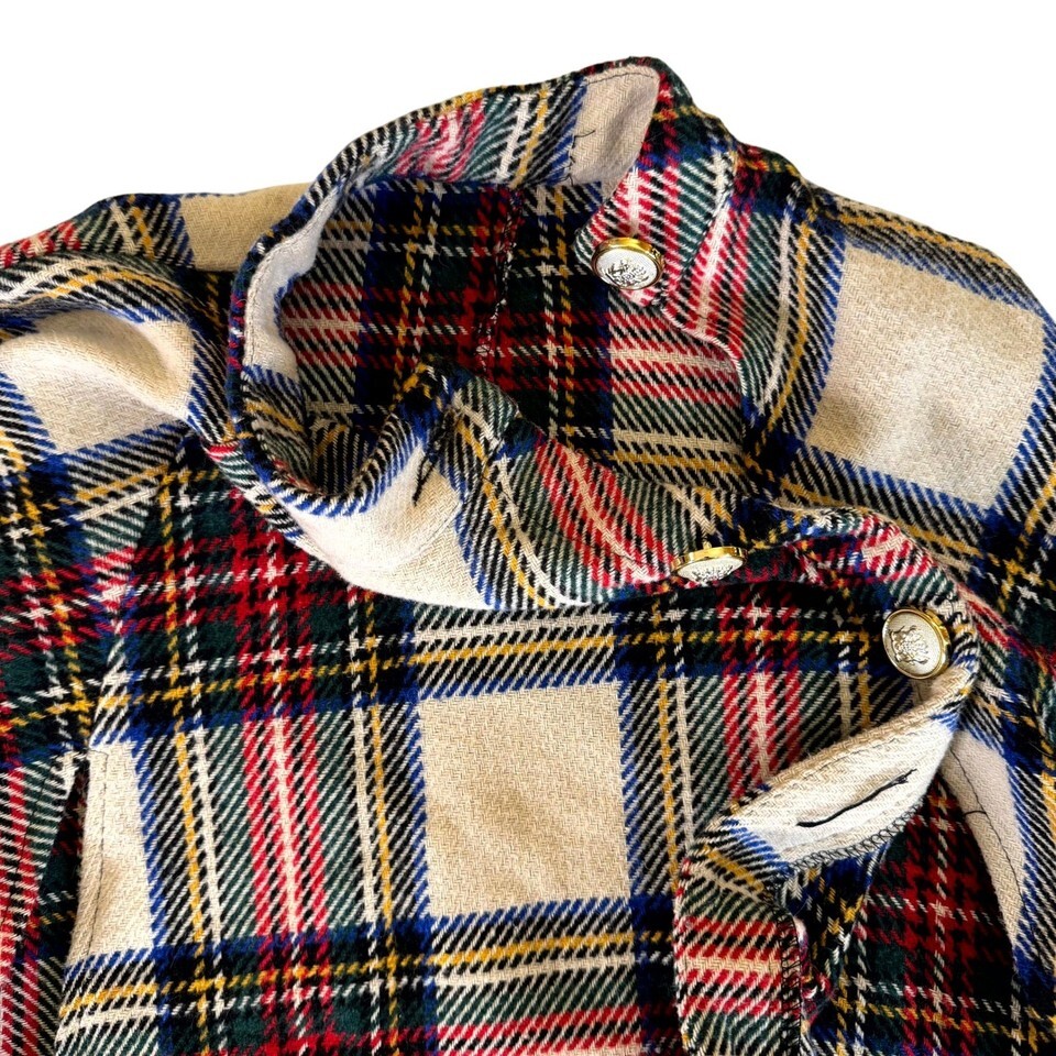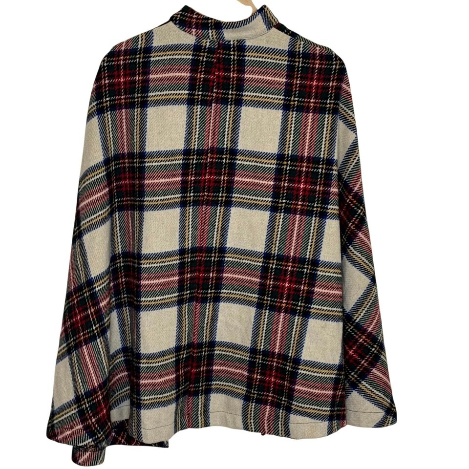 Pullover plaid cape featuring an asymmetric button-neck closure ? only the top button is functional; the rest are decorative. Originally released Fall 2018 (production code outer180904705). Faux front pockets. Classic tartan in cream, red, navy, and yellow. Loose, draped fit with lightly structured shoulders (approx. 15? shoulder, 29? length).