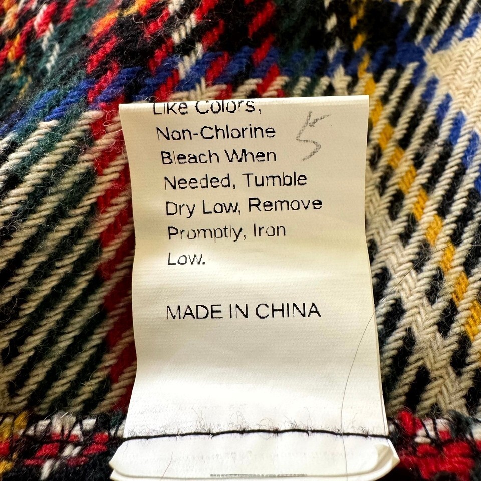 Soft mid-weight 90% polyester / 10% wool fabric; machine-wash cold gentle cycle. Made in China.