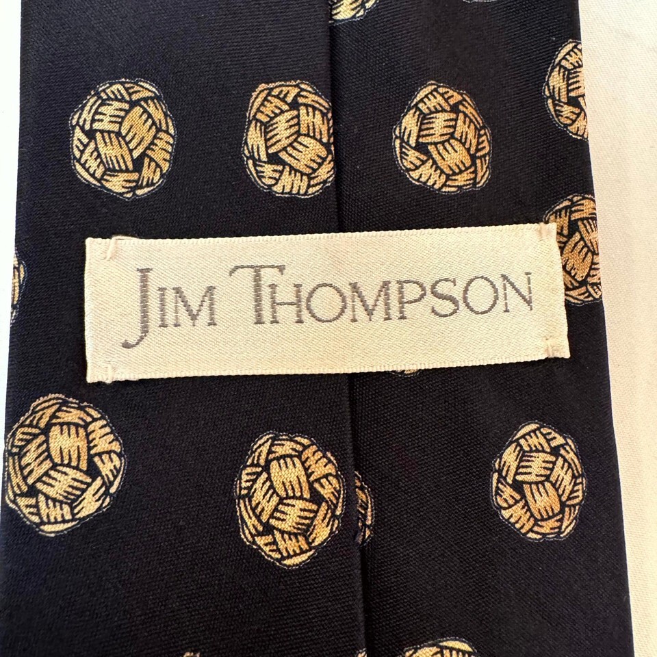 Luxury Jim Thompson tie in deep navy with a repeating golden wicker-ball geometric motif. Handmade in Thailand from 100% Thai silk, offering a refined and timeless look.
