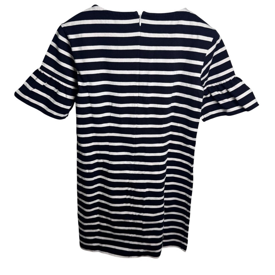 This chic JCrew shift dress features stylish ruffled bell sleeves and a classic black and white design. Perfect for any occasion, it offers a flattering fit and effortless elegance for the modern woman.