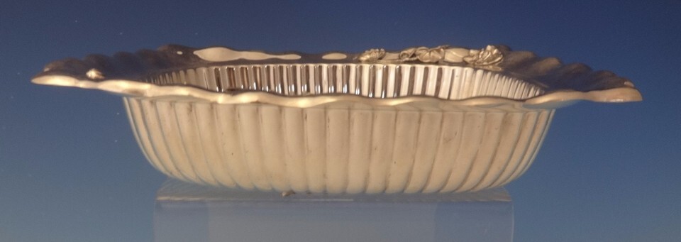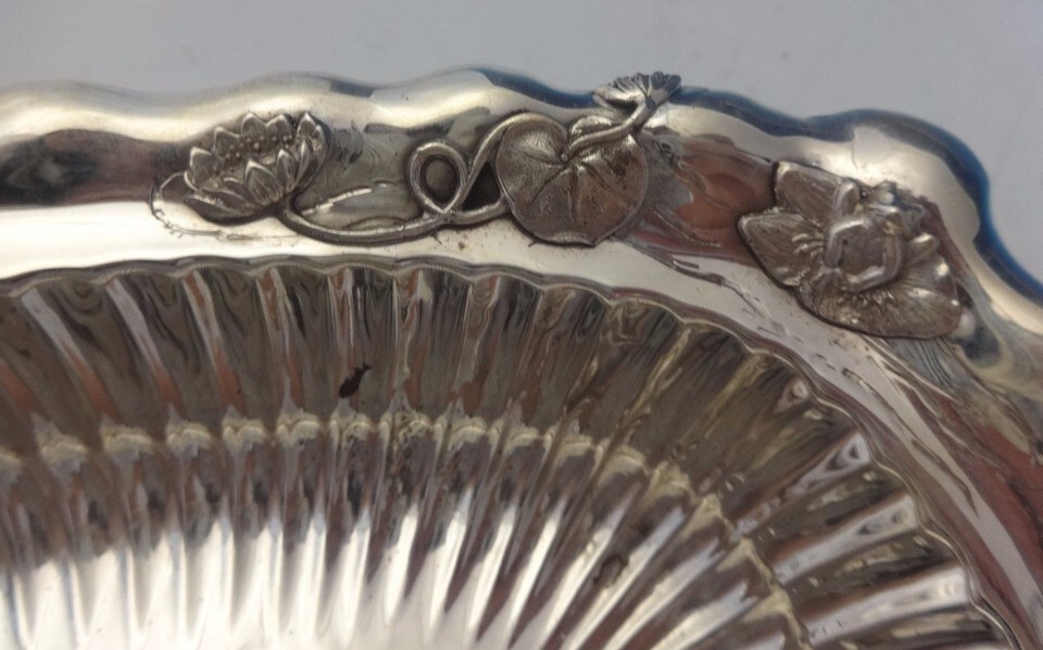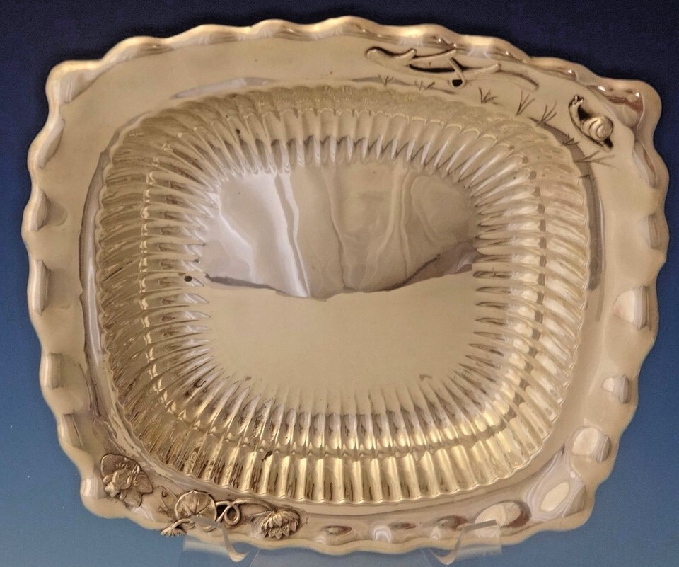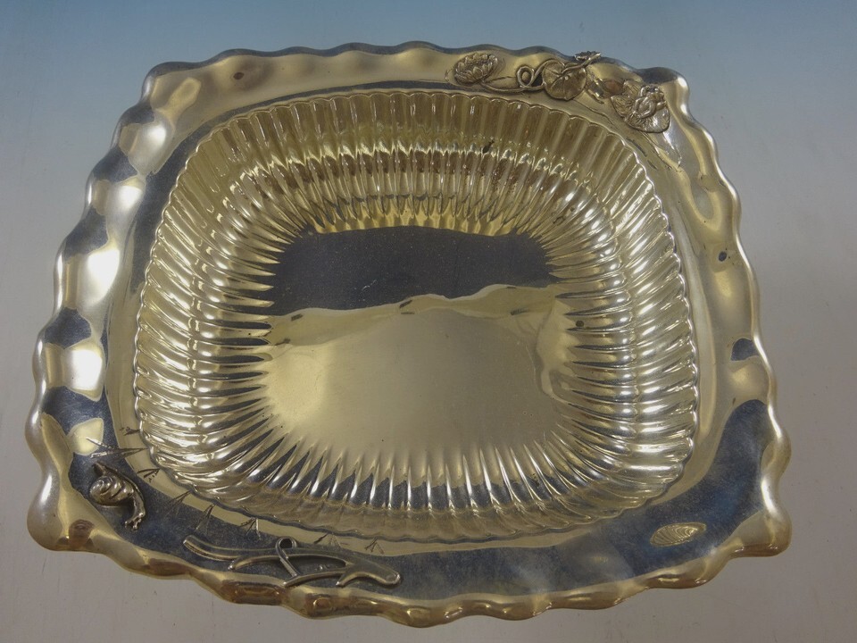 sterling rectangular bowl with beautiful ruffled edge and interior fluting. It features an applied frog, snail, branch, and lily pads with flower. It's marked with