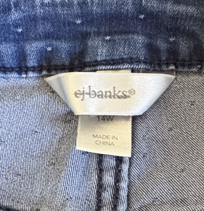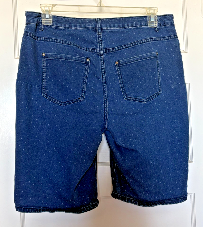 CJ Banks Blue Denim Mom Shorts Size 14W. Chic blue denim shorts with a dotted texture. Ideal for everyday style. Waistband measures 36?. Inseam is 12?. Rise is 10.25?. Total length from the top of the waistband to hem is 23?. 79% Cotton, 18% Polyester, 3% Spandex and Machine Washable. Very Good Used Condition Used Condition - See Photos for further description.