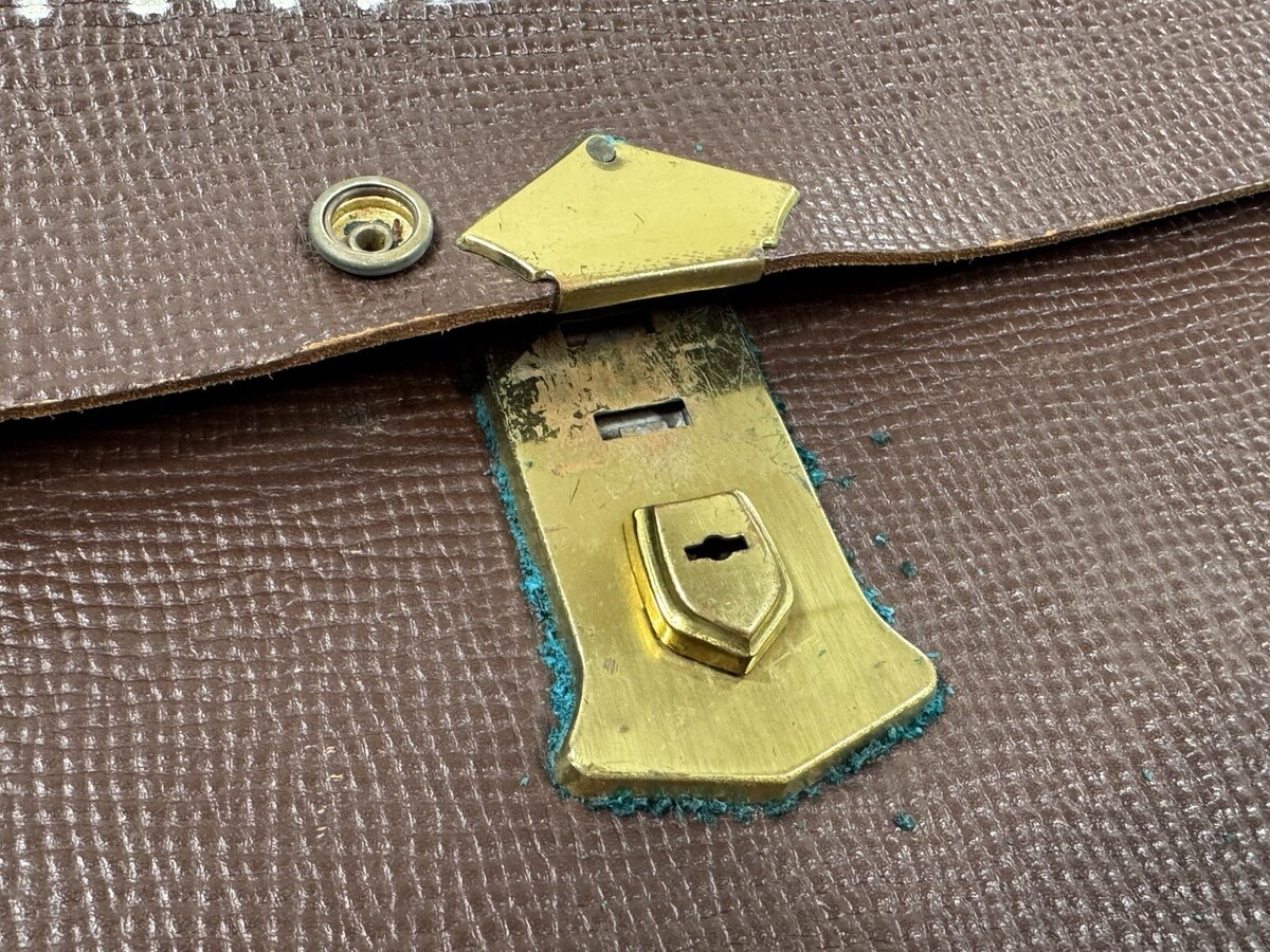 Vintage wear as seen. Name stencil as seen. Some green residue around the metal parts. The clasp does snap in, but does not lock, no key. Please see all photos.