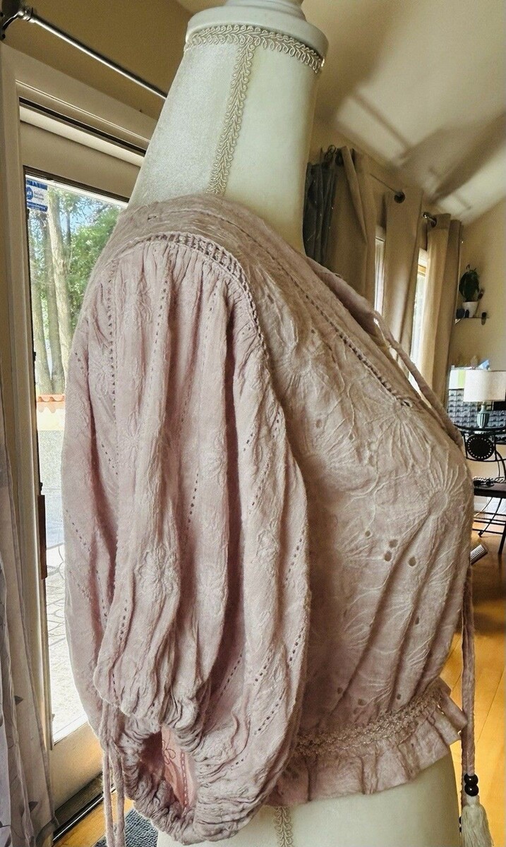 POL Anthropology Women Pink Lace Embroidered Eyelet Crop Top Balloon Sleeves L