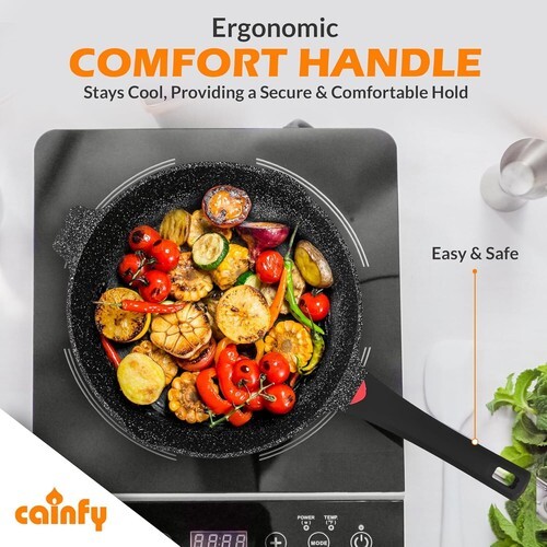 Upgrade your kitchen with this 11-inch nonstick deep frying pan, perfect for everyday cooking. Featuring a durable granite coating that?s PFOA, lead, and cadmium-free, this pan ensures healthier meals and effortless food release. Its spacious 4.27-quart capacity is ideal for frying, sauteing, and searing, while the die-cast aluminum construction provides superior heat distribution for even cooking. The ergonomic stay-cool handle offers a secure and comfortable grip, making it easy to toss and stir. Compatible with all stovetops, including induction, this long-lasting pan delivers professional results in any home kitchen.