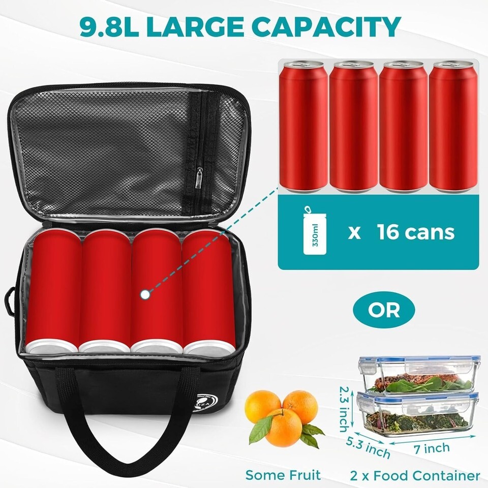??Large Capacity Insulated Lunch Box?This Insulated cooler bag is 10.24" x 7.09" x 8.27". The maximum capacity is 9.8L, big enough to fit 11 tins of 330ml coke, wide-open square design can easily store your sandwiches, salad, drinks and fruits in this insulated lunch bag. Front zippered pocket are for napkins, cutlery, opener and other essentials. Put your water bottles or energy drinks inside the mesh pocket. It can fit all your lunch need whole day to take foods and snacks. br/