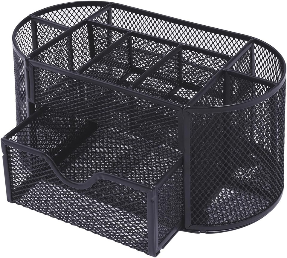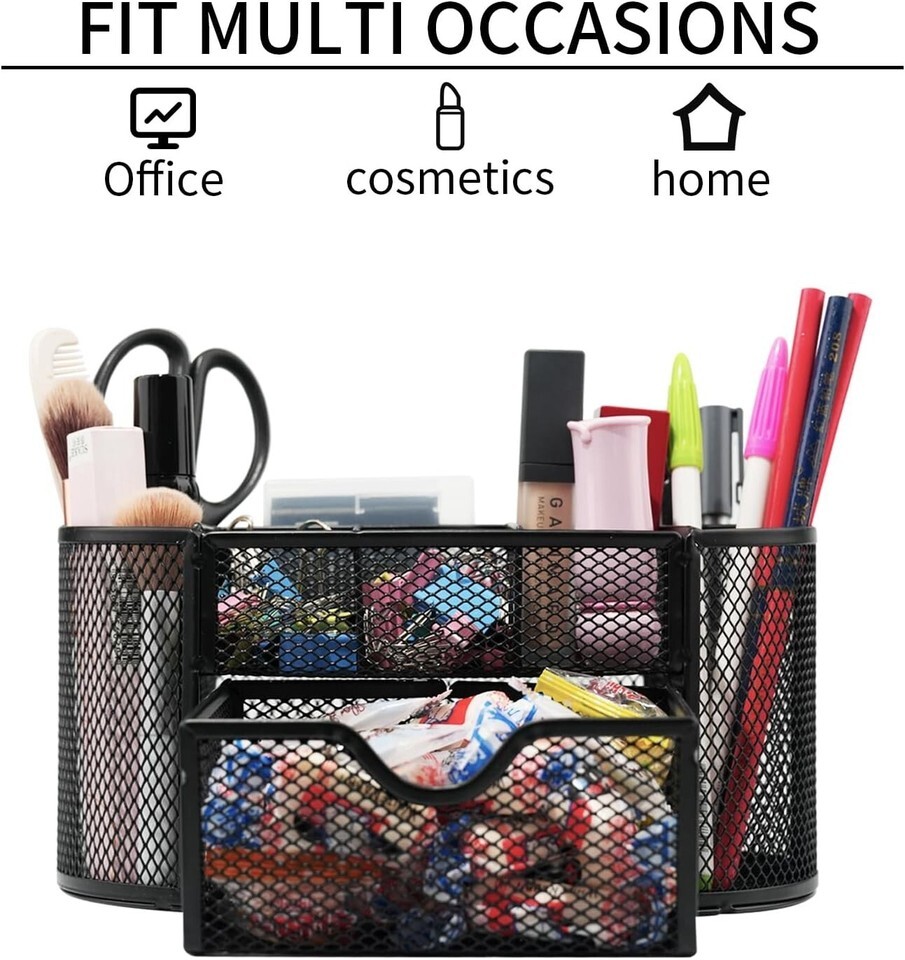 This desktop organizer is an excellent desk accessory for home, office, and school. It can organize small stationery items, scissors, tape, staplers, USB flash drives, erasers, rubber bands, whiteboard pens, rulers, pens, pencils, paper clips, highlighters, markers, glue, and even makeup, color cosmetics, jewelry, lipsticks, keys, and presbyopes and more.