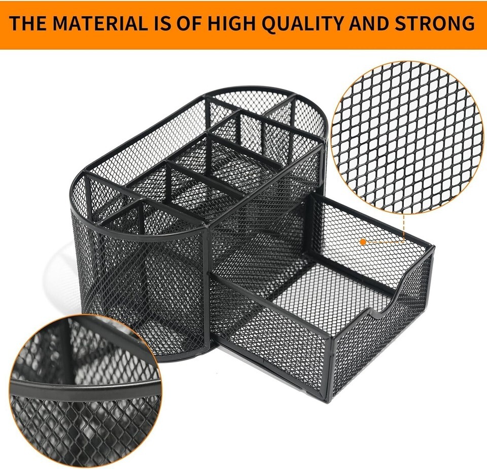 The design is unique, the wire mesh makes it easy to see the materials inside and quickly select what you need, The bottom of the pen holder has a non-slip pad to avoid slipping and scratching.
