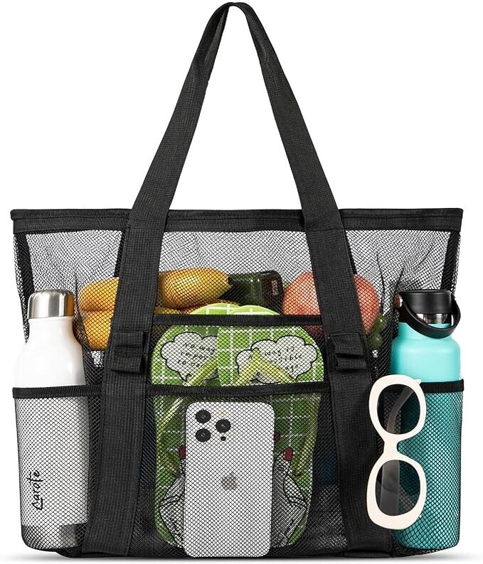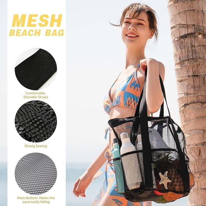 ?Excellent Material - The beach bag is made of high-quality tear resistant mesh material, which is not easy to wear. The wide and sturdy nylon strap is easy to carry and reduces pressure. The mesh design keeps the interior dry, preventing towels and clothes from being constantly damp. The mesh bottom makes it easy for sand to fall off and keeps the interior clean.