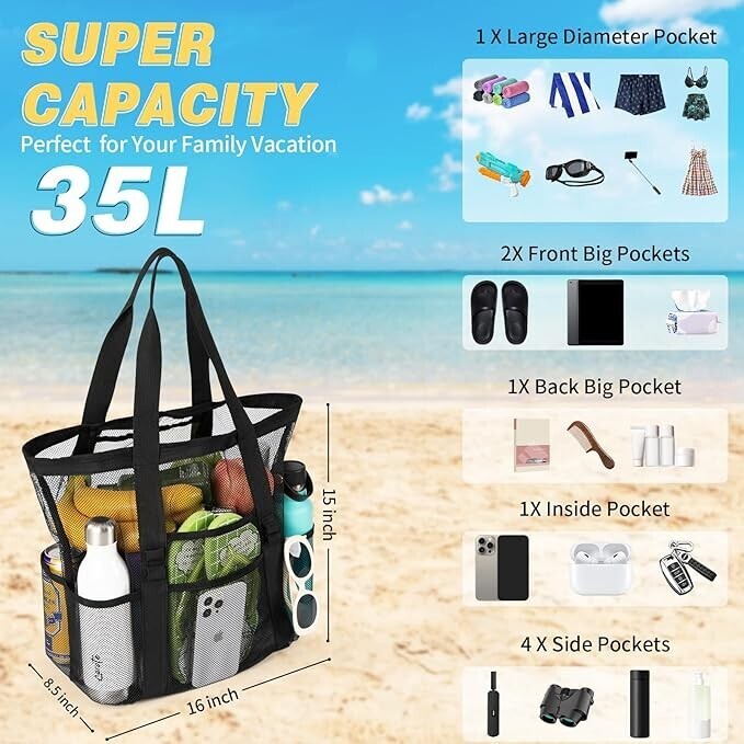 Mesh Beach Bag, Large Beach Bags for Women 13.8 "long x 6.5" wide x 15.5 "high