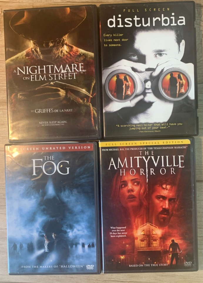 This DVD lot includes nine classic horror movie remakes such as Halloween, Amityville, and Nightmare on Elm Street. Each movie is presented in DVD format and offers a thrilling experience for horror fans. The collection features a variety of genres including slasher, supernatural, and psychological thrillers.
