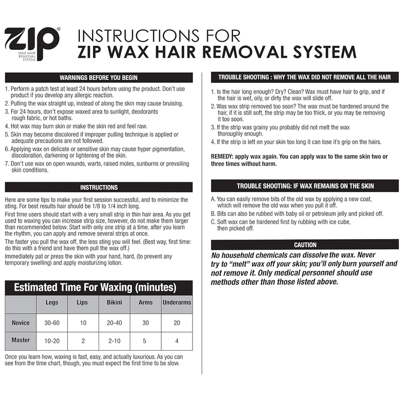 Zip is made of a hot film depilatory wax with Brazilian Rosin for unique flexibility.