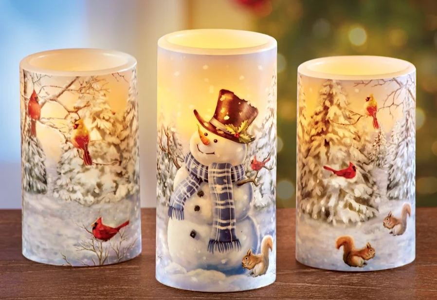 3Pc Flameless Candle Set LED Flickering Pillar Christmas Snowman Cardinal Decor