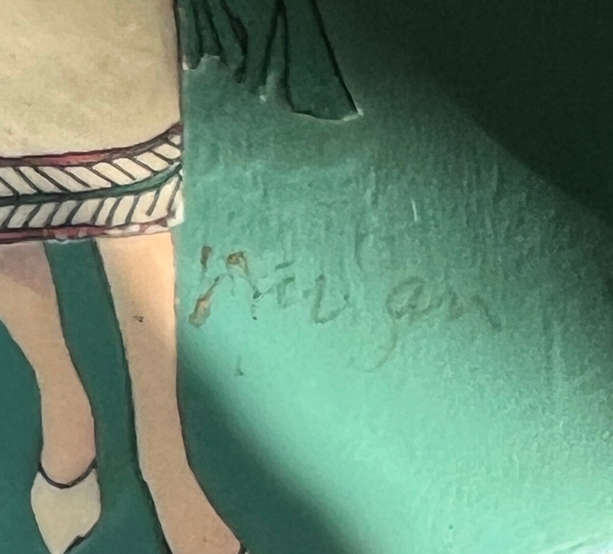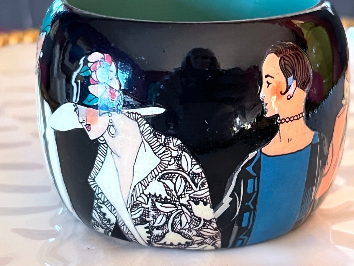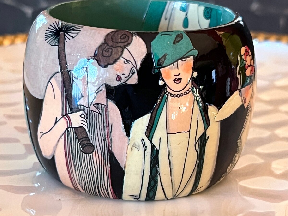 This gorgeous one of a kind decoupage? Handpainted? I cannot decide, but it IS simply beautiful. I can't find any info on the artist( it is signed inside " Mar San or Marsan") - it seems like it is enameled on the outside and there's even half a woman's body on the inside of the bracelet-- HOW???? Also, could be a 70s-80s replica of 1920s. Sorry I don't know more.