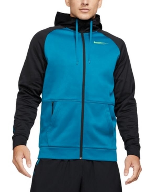 Stay ahead of the game with the trendsetting sports designs of Nike men's activewear and accessories. Whether you are searching for the latest looks in sports apparel, shopping for a new pair of kicks, looking for the freshest on-the-go gear or just stocking up on the basics, there is a great selection to choose from. Step out in Stylish Sportswear from the top to your tip of your toes NIKE Style: Sweater Occasion: Casual Size: L Material: 100% Polyester Color: Turquoise Color Block Pocketed Zippered Drawstring Hood Full Zip Moisture Wicking