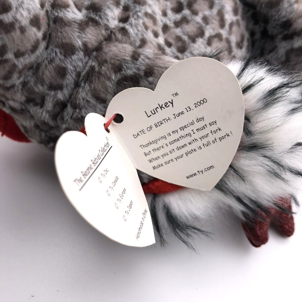 TY Beanie Babies Lurkey the Turkey inch DOB 6/13/2000. Beanie baby is in good, clean condition, tag and toy may have some minor wear from storage. Still has tush tag and heart tag attached.