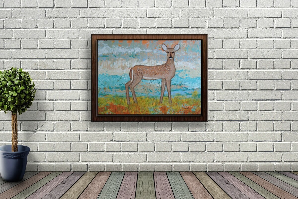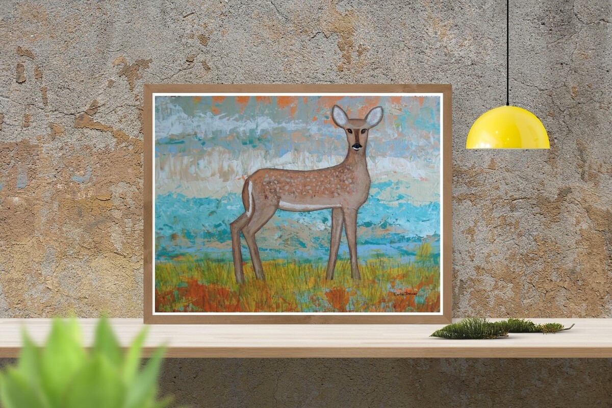 This stunning painting titled "Deer" is an original piece by Canadian artist Carla Dancey. The painting depicts a beautiful deer doe in a natural setting, surrounded by North American wildlife and landscape. Created using acrylic paint on canvas board, the artwork is sized at 14 inches by 11 inches and is unframed.