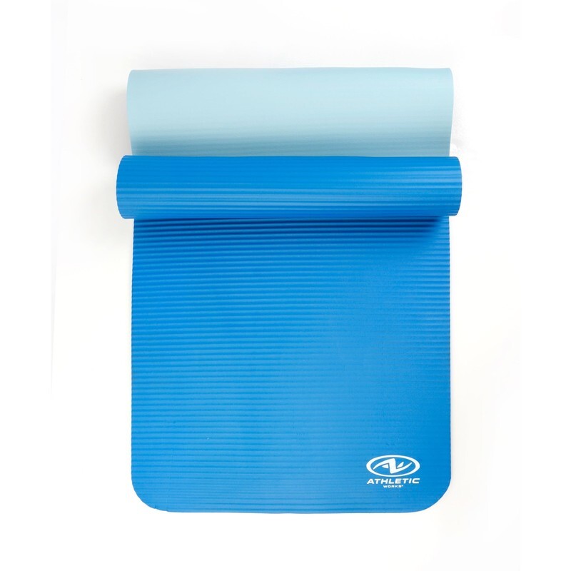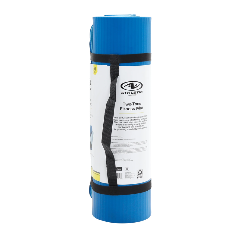 Athletic Works Two Tone Fitness Mat, 10mm, 72inx24in, Blue Color, NBR Foam, with Carry Strap. Comfortable and slip-resistant workout surface which is perfect for yoga, stretching and other exercises. Workout in comfort with textured padding and cushioning to support your elbows, knees, and back when posing, stretching and toning. Lightweight and durable makes it easy to transport and carry anywhere. Easy to clean so it won't matter how hard you choose to workout. When you're done it folds for easy storage and simple transport. Flexible material that can accommodate both short and tall people.